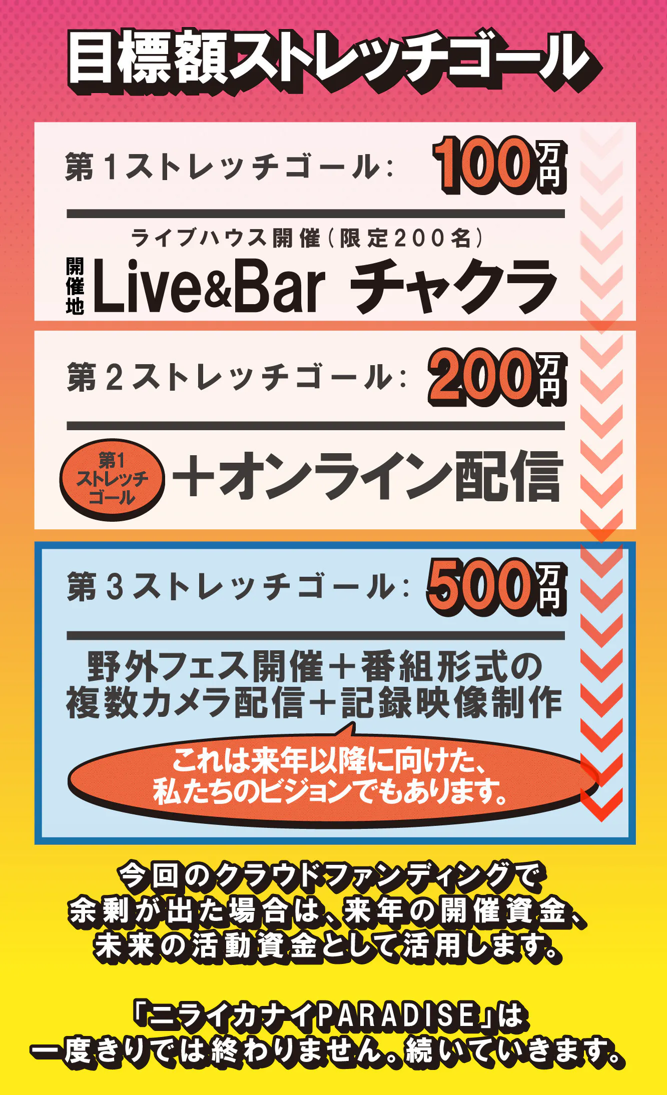 このプロジェクトは、クラウドファンディングの達成額に応じてイベントの規模が進化する仕組みです。