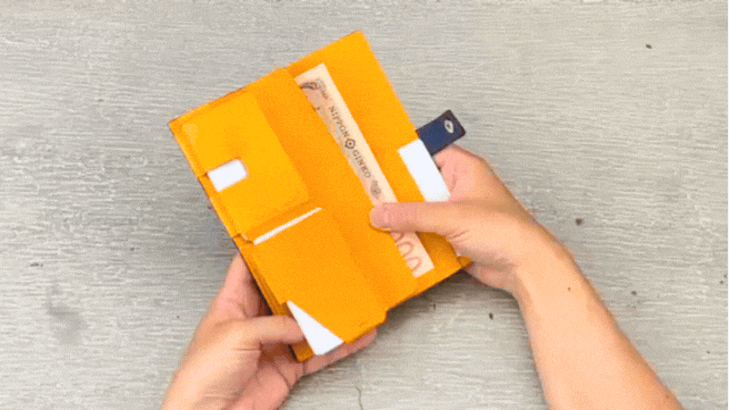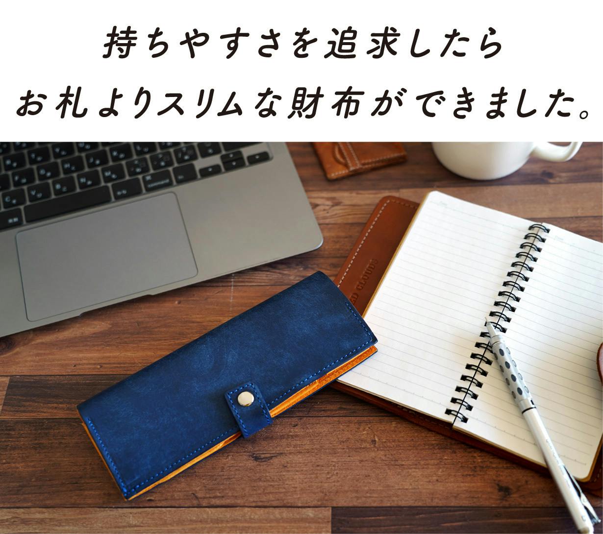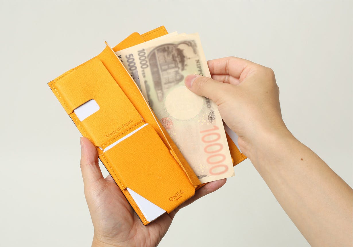 お札を縦半分に曲げて収納することでお札より小さいスリムな財布を実現しました。