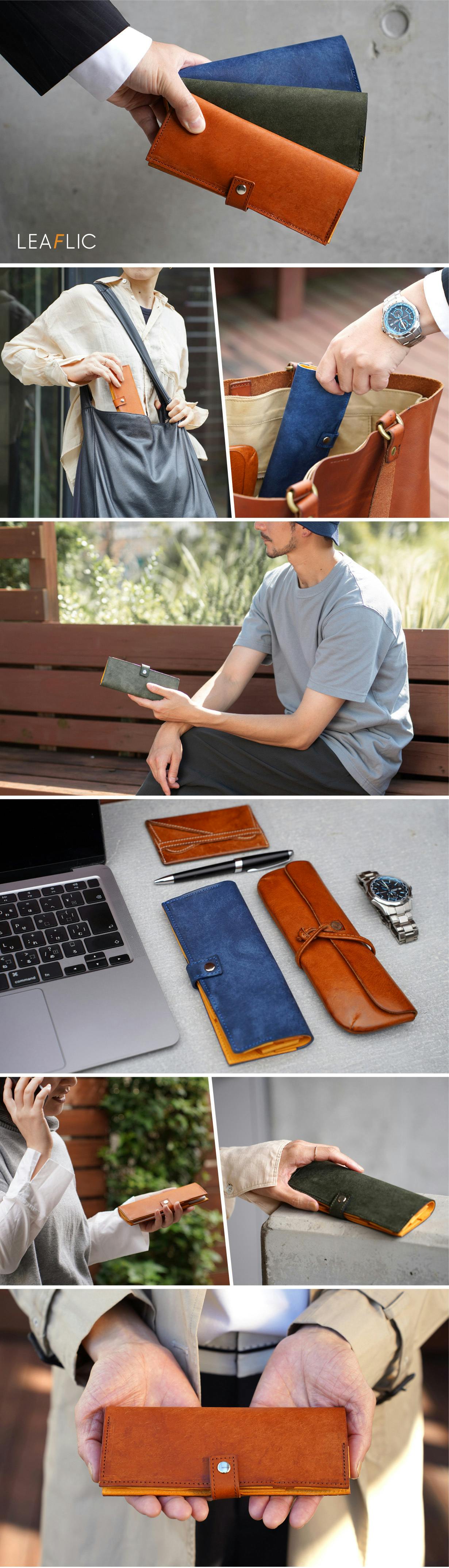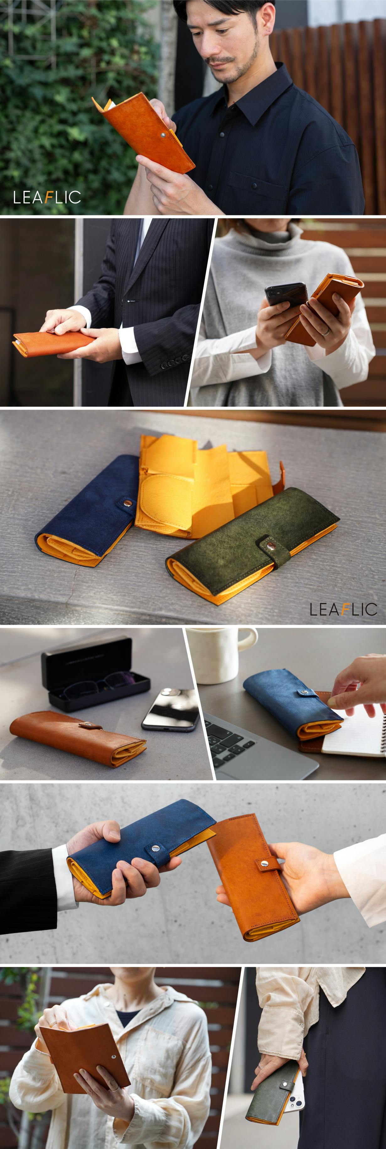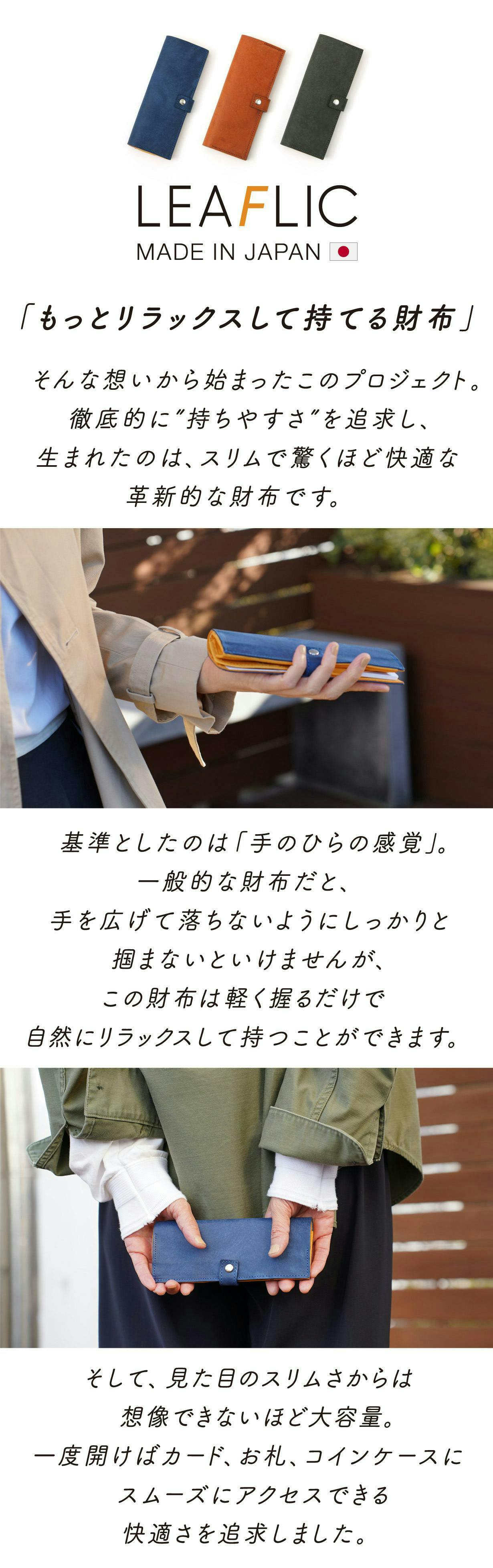 『LEAFLIC SLIM / リーフリック スリム』はシリーズの特徴である、たたむ時にコインポケットとカードホルダーが重ならないオーバーラップ構造を踏襲しながら、お札の幅よりもスリムで、持ちやすさがくせになる、新感覚の財布を実現しました。