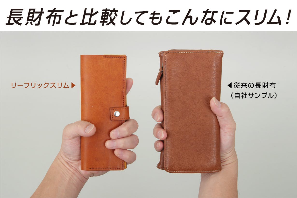 従来の長財布(右)と比べてもリーフリックスリム(左)は握れるほどスリム。