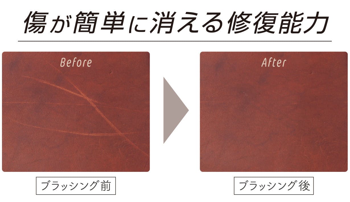 オイルをたっぷり含んでいるので、エイジングが進むと爪でついたひっかき傷なども、ブラシで強めに擦ることで簡単に消えてしまいます。張りのある豚毛ブラシがお勧めです。