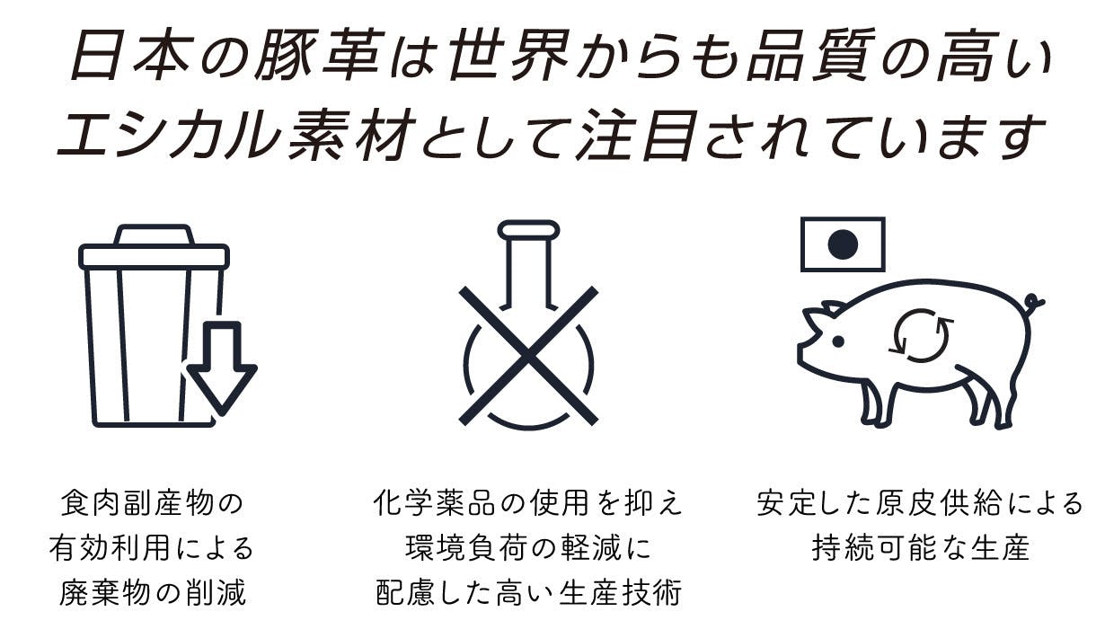 SDGs目標達成に向けてチャレンジする東京のタンナーの革で、フリーストールで飼育された豚の皮を使用し、人にも環境にも優しい仕上げです。耐久性も高く、しっとりとした質感で肌触りが良い革です。