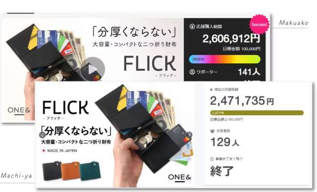 カードとコインが重なるから分厚くなるというのは多くのコンパクト財布で共通の認識だったので、容量を減らさずに薄くするレイアウトを試行錯誤し、後に特許を取得した「カードとコインが重ならないたたみ方」を採用した、LEAFLICの前身である「FLICK / フリック」が生まれました。