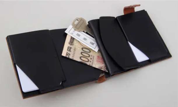 お札を縦半分に曲げて収納するという斬新さ。⾧財布とも二つ折り財布とも言えないので、スリム財布とでもいうべき新しいジャンルです。