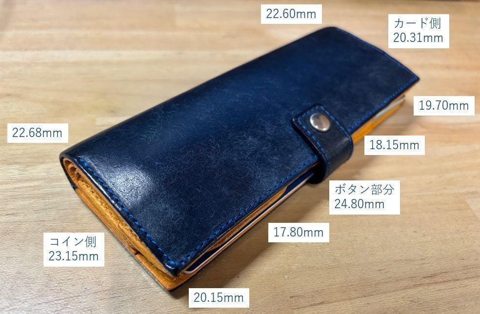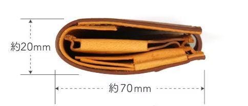 中身を入れても約2cmほどの厚みということですね。スリムなうえに薄さをキープできてますね。今回は今財布に入っているもので計測しましたが、もう少し入ります。もちろん中身に合わせて厚みも増します。