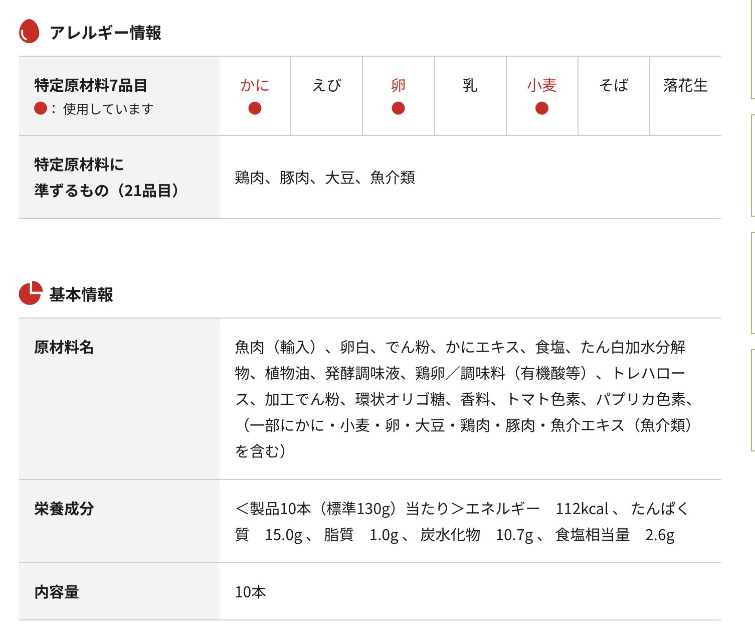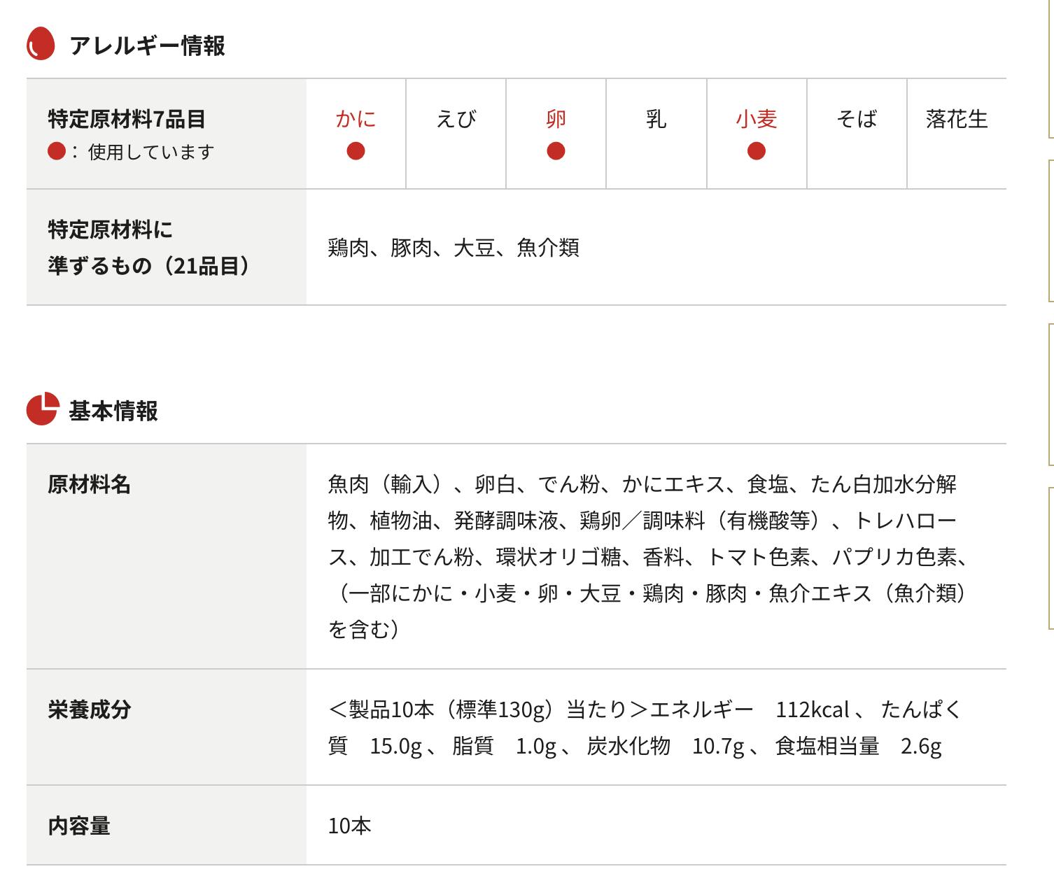 ・原材料、主原料の原産地:魚肉(輸入)、卵白、でん粉、かにエキス、食塩、たん白加水分解物、植物油、発酵調味液、鶏卵/調味料(有機酸等)、トレハロース、加工でん粉、環状オリゴ糖、香料、トマト色素、パプリカ色素、(一部にかに・小麦・卵・大豆・鶏肉・豚肉・魚介エキス(魚介類)を含む)