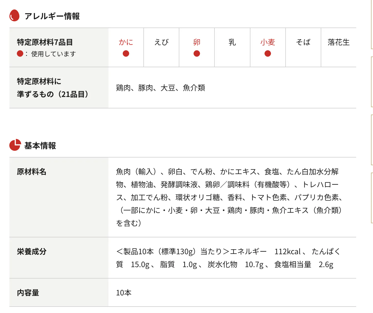 <製品10本(標準130g)当たり>エネルギー 112kcal 、 たんぱく質 15.0g 、 脂質 1.0g 、 炭水化物 10.7g 、 食塩相当量 2.6g