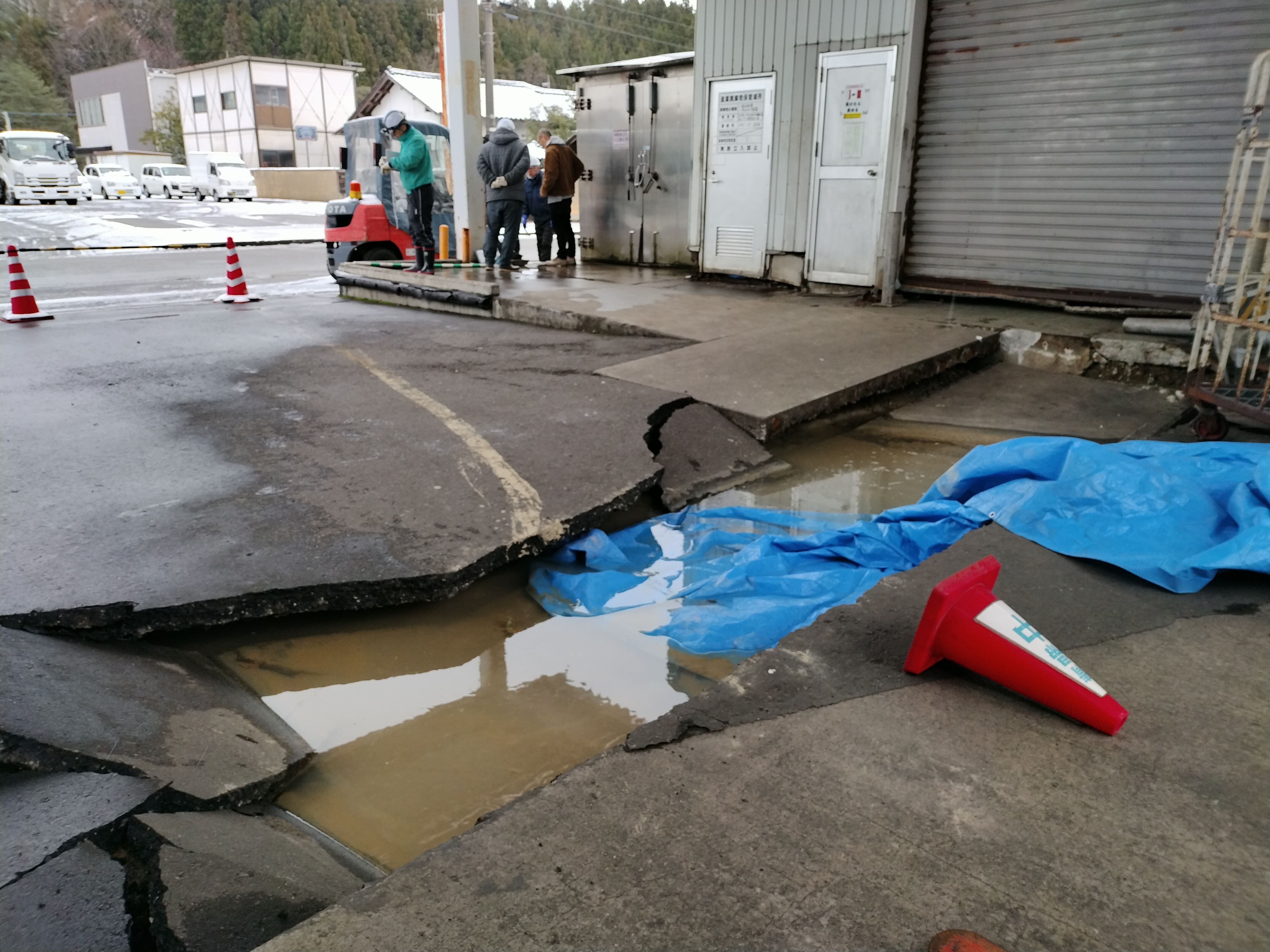 カニカマ工場の玄関が陥没、地中の配管が破壊し給排水ができない状況に