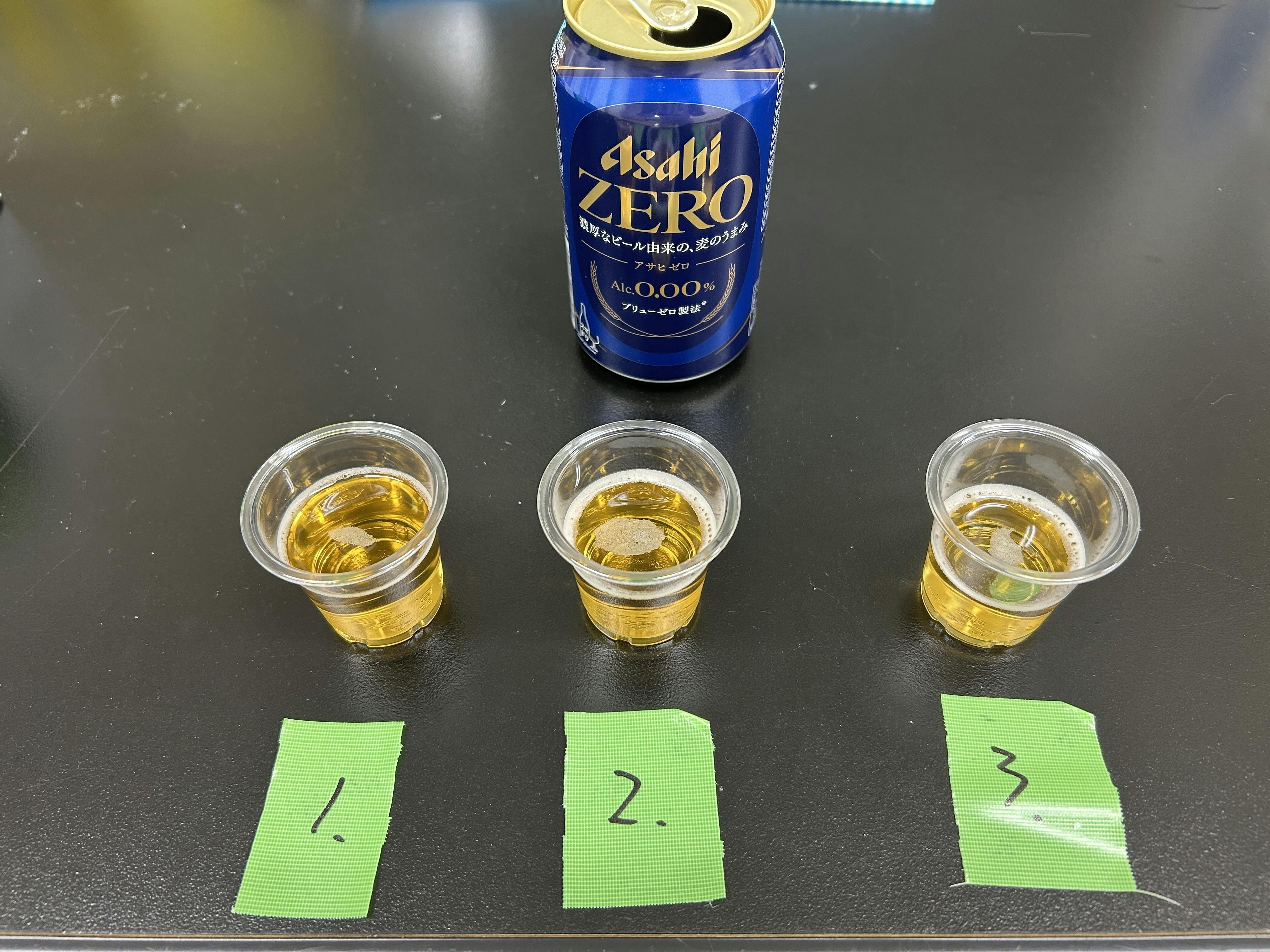 ビール開発をスタートするにあたり、最初に行ったのが「各社のノンアルコールビール飲み比べ」でした。弊社はバスも通らない田舎の山の中にあるため、車通勤必須なのです。そのため会社では飲酒できないという事情からせめて望む味に近いノンアルビールを探し、「これをベースにしたら方向性がつかめそうだ!」という感覚を得るためです。最終的には〇サヒの〇EROがいいんじゃない?となってコレを“叩き台”として、試作を始めていきました。