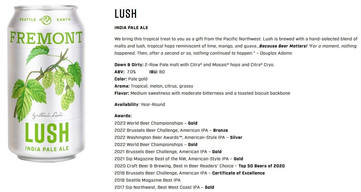 "We bring this tropical treat to you as a gift from the Pacific Northwest. Lush is brewed with a hand-selected blend of malts and lush, tropical hops reminiscent of lime, mango, and guava…Because Beer Matters! “For a moment, nothing happened. Then, after a second or so, nothing continued to happen.” – Douglas Adams"