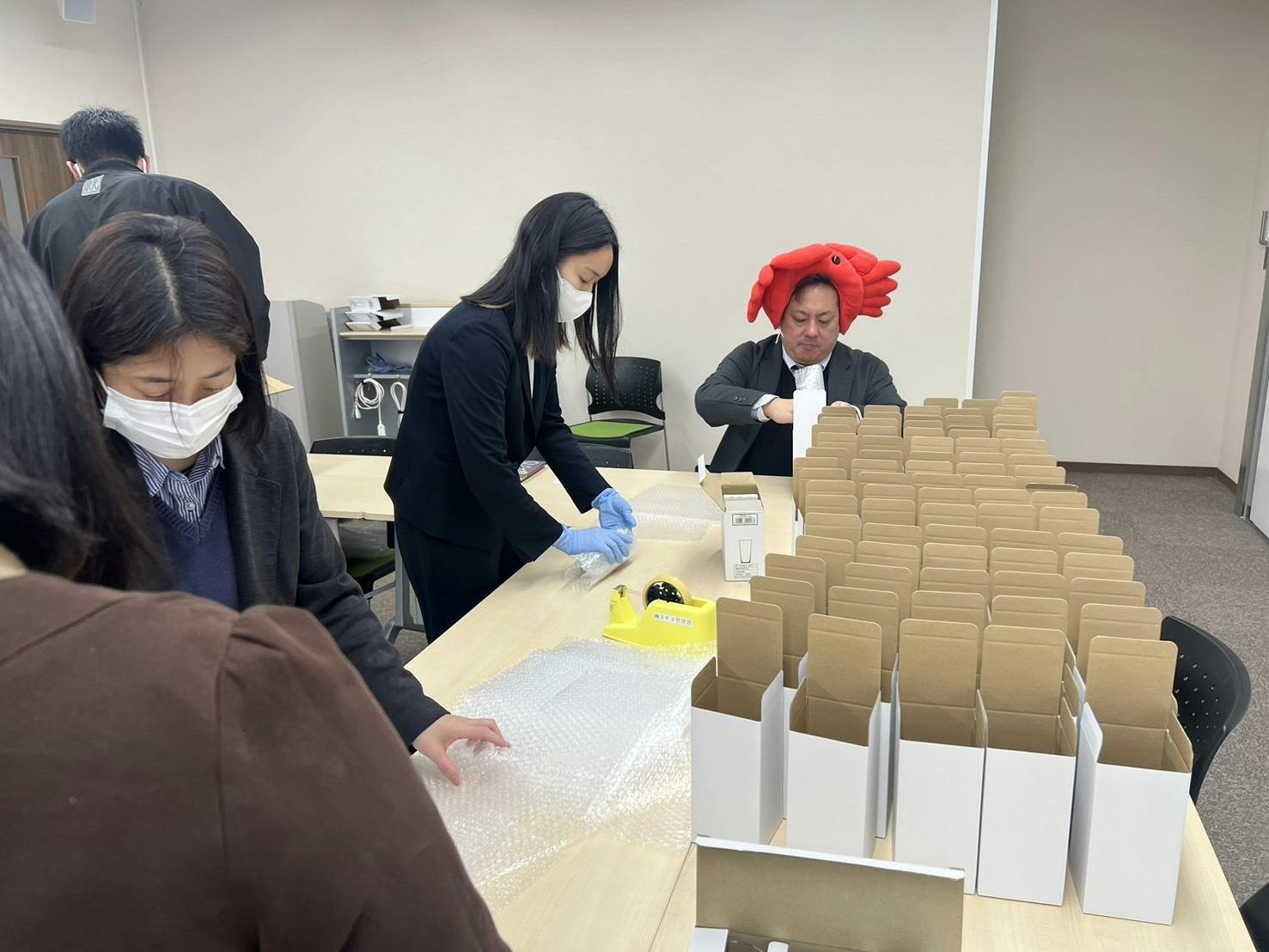 こちらは一生懸命カニカマエール専用グラスを詰めている様子