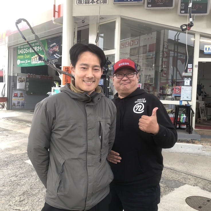 左:森本 右:有馬監督皆様はじめまして。本プロジェクトを主催するNPO法人チーム能登喰いしん坊の代表理事の森本敬一です。石川県穴水町で小さなフルサービスのガソリンスタンドを経営しています。