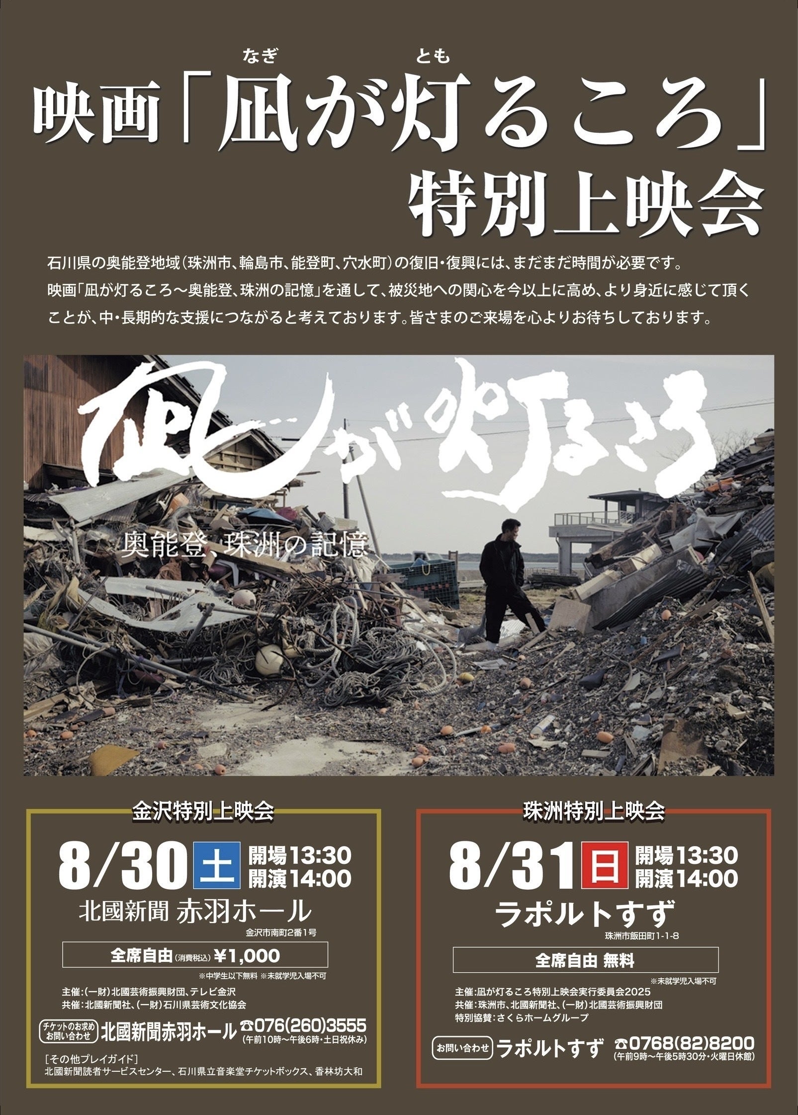 珠洲市での上映は、「凪が灯るころ特別上映会実行委員会2025」が主催となり無料で鑑賞できます。