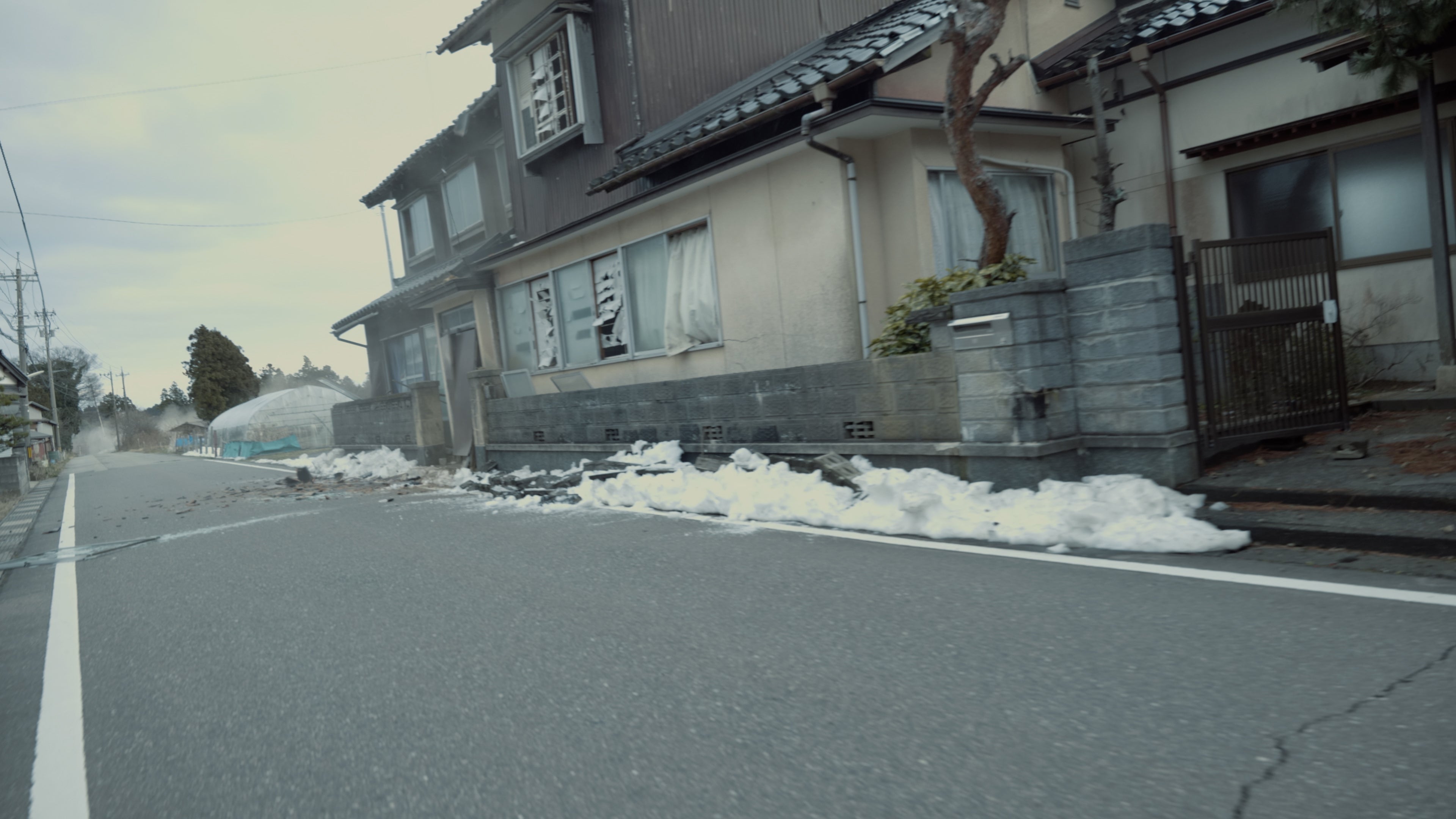 2025年元日4時10分の発災当時の様子も本編の中には含まれております。気分を害する方はお気を付けください。当日アナウンスもさせていただきます。左奥には砂煙が見えます。手前のアスファルトは亀裂が入って開いたり閉じたりしています。
