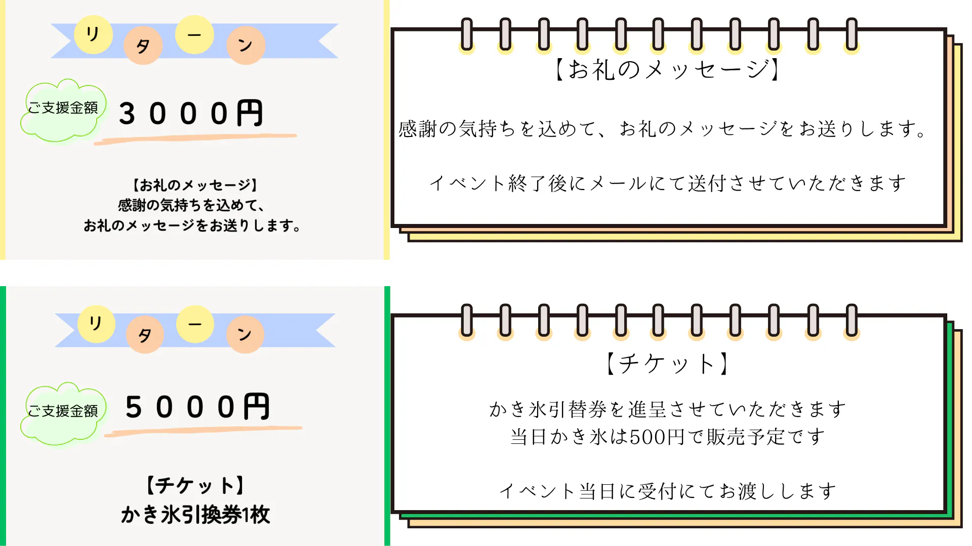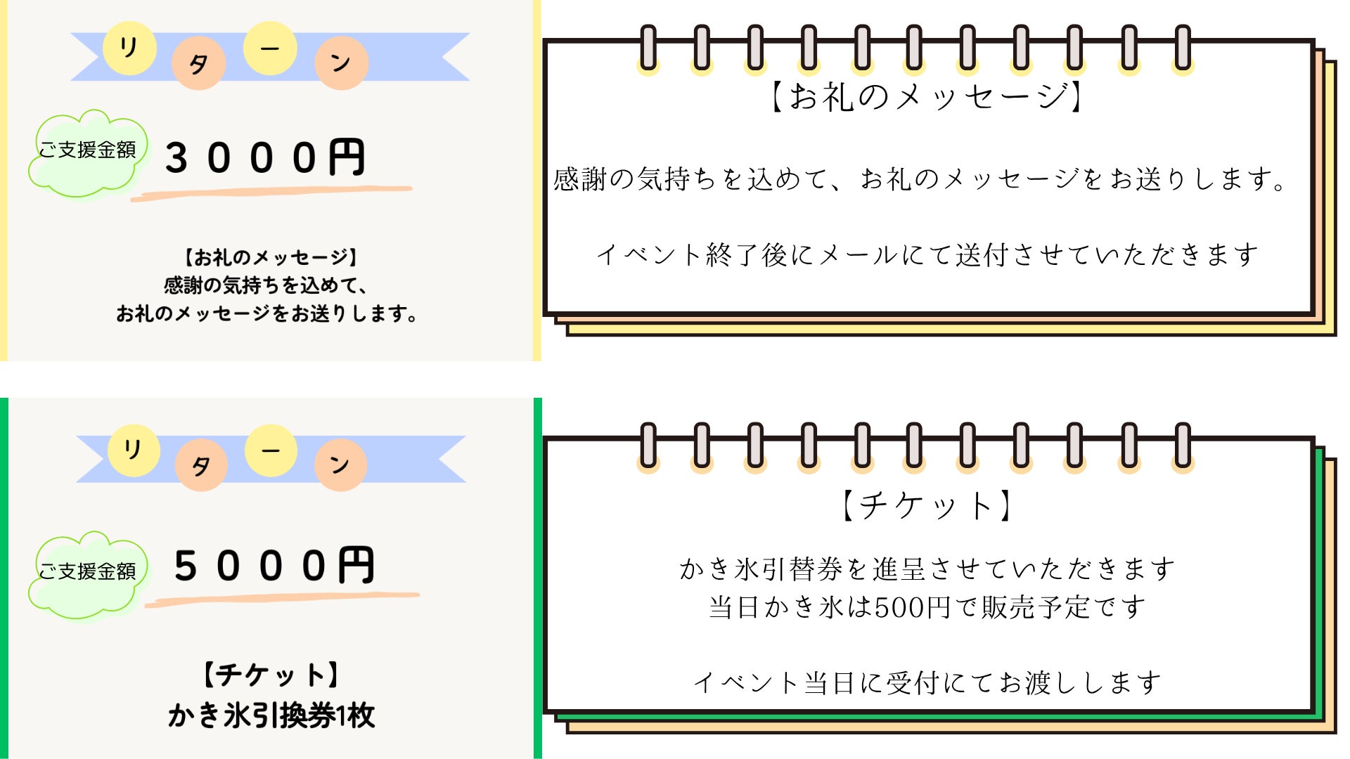 3,000円、5,000円、10,000円、30,000円となっております。ご支援の程よろしくお願いします。