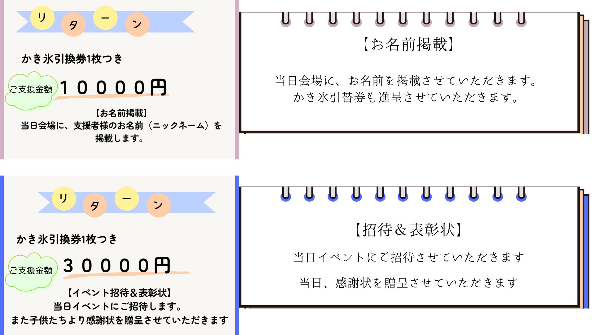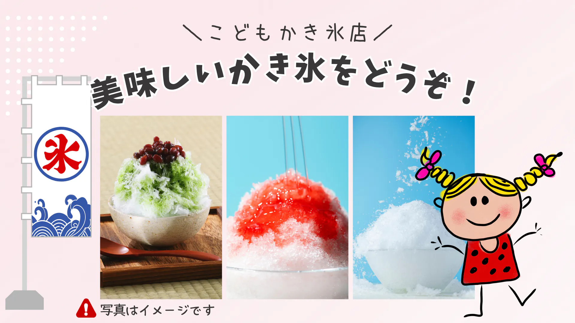 子供たちがおそろいのユニフォームを着て、かき氷屋さんの店員になり地域の方々がお客さんとなって子供たちのかき氷を食べる、もちろんお代もしっかりいただいて子供たちの社会勉強のひとつになるようなイベントにしたいと思います。