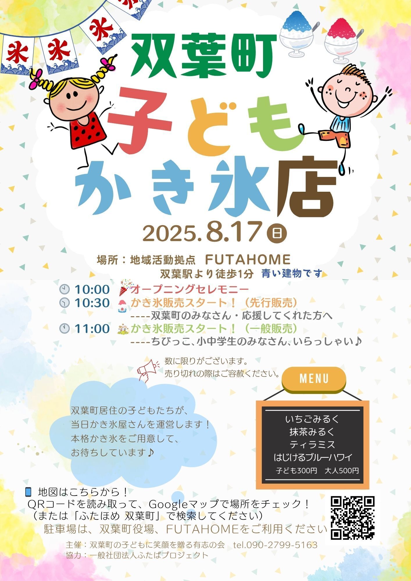 いよいよ、かき氷イベントの開催まであと10日となりました!クラウドファンディングを通じてご支援いただき、心より感謝申し上げます。ここ双葉町も毎日暑い日が続いています。子どもたちは夏休みに入り、近くの畑でジャガイモ掘りをしたり、簡易プールで水遊びをしたりと、元気に過ごしています。皆様のご支援を無駄にせず、現在準備を着々と進めています。当日は、ぜひ双葉町にお越しいただき、かき氷を楽しんでください!