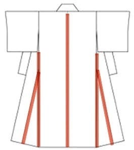 「手縫い・ミシン併用仕立て」では、背・脇・衽つけ(画像赤線箇所)の直線部分をミシンで縫製しているC. 価格について