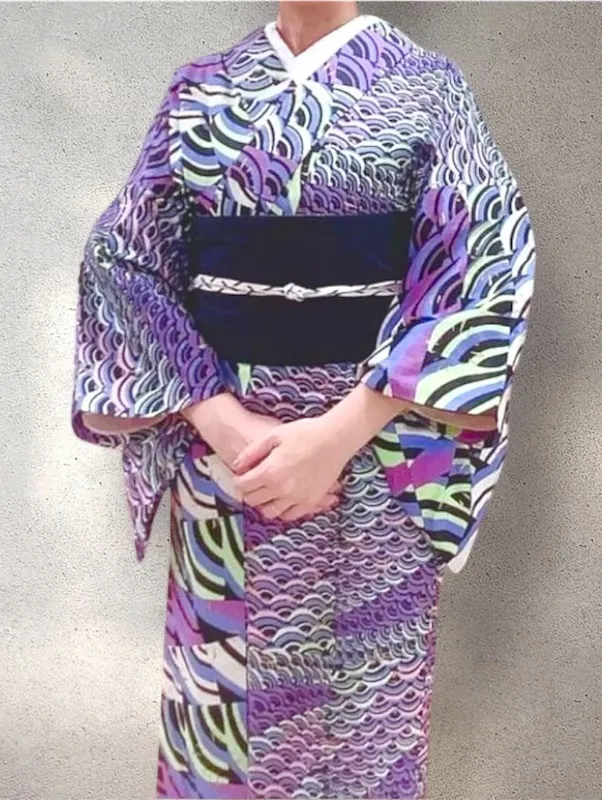 アフリカンスタイルの半幅帯を商品にするなら、自分自身も半幅帯の基本構造や仕立て方を改めて学びなおしたいと思い、和裁教室に通いました。半幅帯の仕立て方について学んだ後、アフリカの生地で自分用の着物も仕立ててみました。