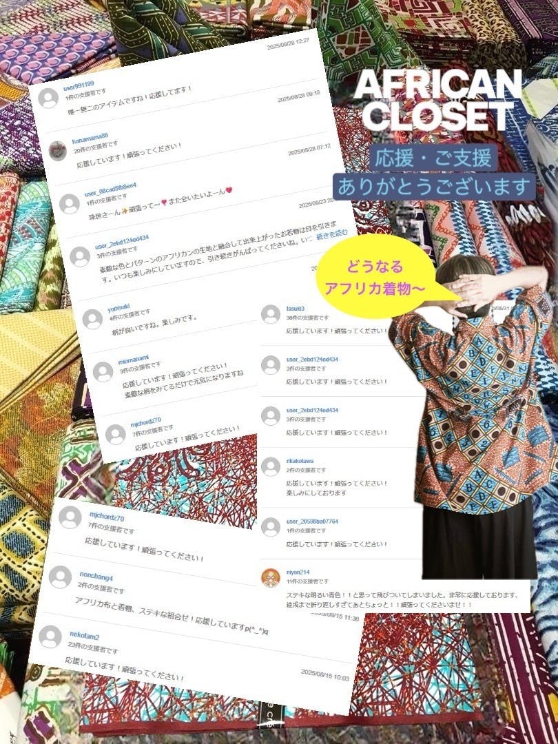 目標達成のご報告いつも温かい応援・ご支援をいただき、誠にありがとうございます。8月15日のスタートから約2週間。皆さまからの「がんばれよー!」という力強い思いに支えられ、目標金額10万円を達成することができました。心より感謝申し上げます。今回のクラウドファンディングでは、AFRICAN CLOSET(通称:アフクロ)オリジナルの袋物バッグ「A-FUKURO(えぇ袋! “Nice bags!”)」が主力アイテムとなり、その力強さを実感する機会となりました。年内にはいくつかのイベント参加も予定しています。皆さまにもっと気軽に、もっと楽しく手に取っていただけるよう、さらに工夫を重ねながらA-FUKUROの製作を続けてまいります。プロジェクト期間残すところ1ヶ月-アフクロのアフリカ着物今回のプロジェクトでは、和裁士による完全手縫いの着物から和裁専用ミシンでお仕立てした着物まで、多彩な顔ぶれのアフクロ着物をクラファン限定価格で提供しているところが最大の魅力。「アフリカ着物、ちょっと着てみたいかも」「アフリカ着物にハマってます」という皆さまの思いをアフクロの着物でサポートします。ご不明な点がありましたら、メッセージにてお気軽にお問い合わせください。お友だちやご家族の皆さまでアフクロプロジェクトを話題にしていただければ幸いです。https://camp-fire.jp/projects/855620/view引き続きご注目のほどよろしくお願い致します!!!