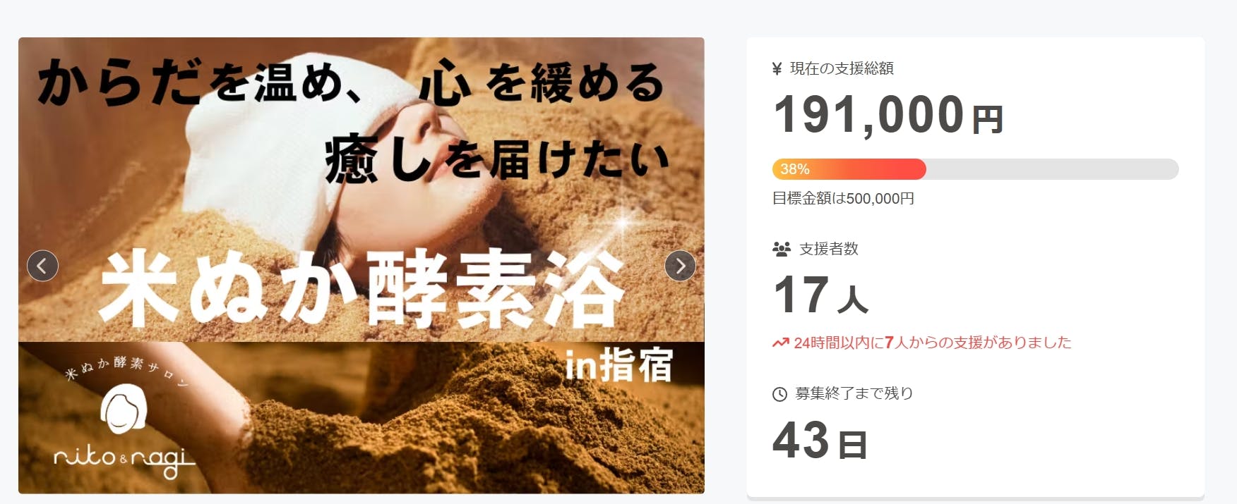 おかげさまで、目標金額50万円のうち38%を達成することができました。皆さんのご支援によりこのようなスタートを迎えれていることに感激しています。
