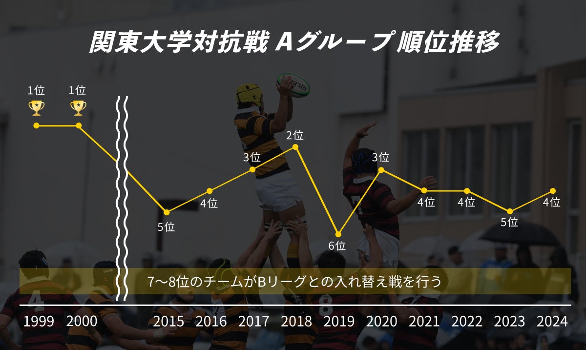 最後に大学選手権で優勝したのは1999年度、関東大学ラグビー対抗戦での1位も2000年度が最後です。以降は2〜6位の順位で奮闘しながら、強豪チームになんとかくらいついてきました。