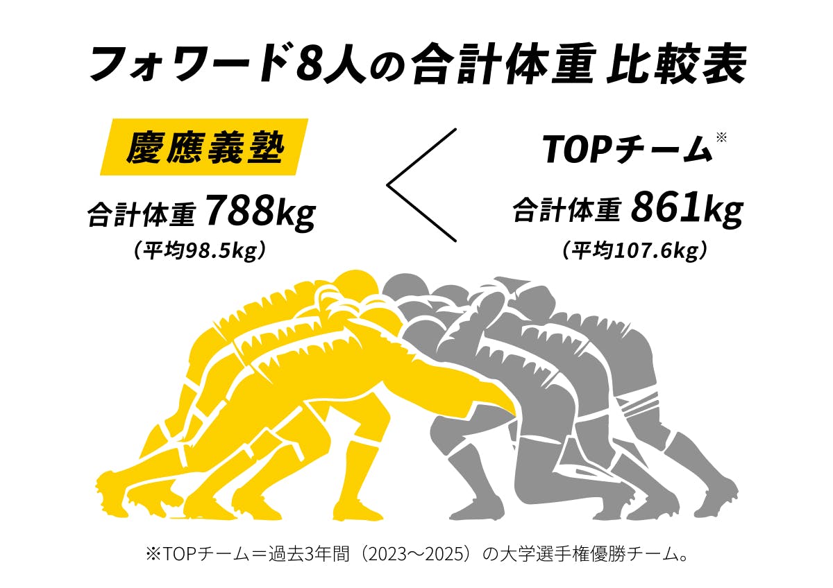 ※2)TOPチームの数値は、日本ラグビーフットボール協会「大会・試合情報」より、過去3年間(2023~2025)の大学選手権優勝チームにおけるFW8人の体重をもとに平均を算出。慶應の数値は、2025年度春季大会に出場したFW8人の体重から算出。