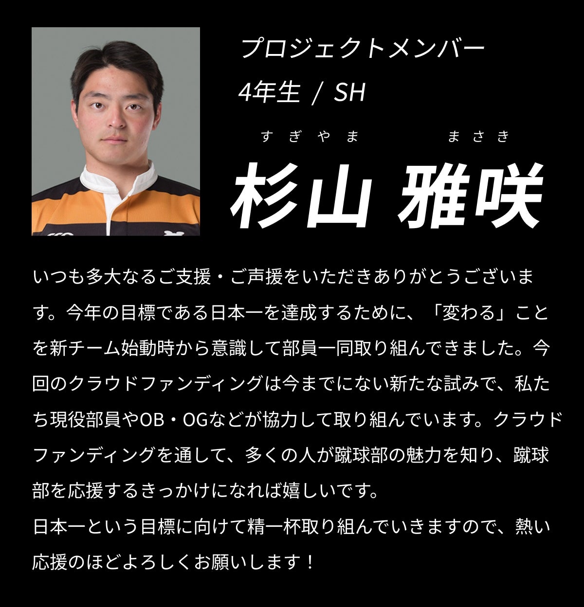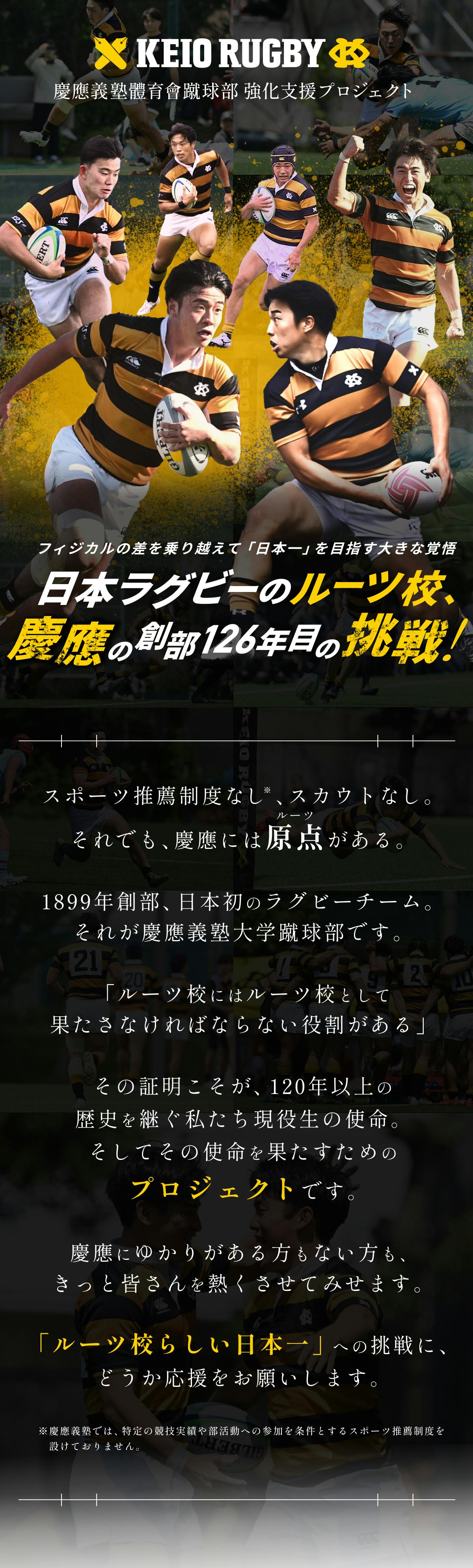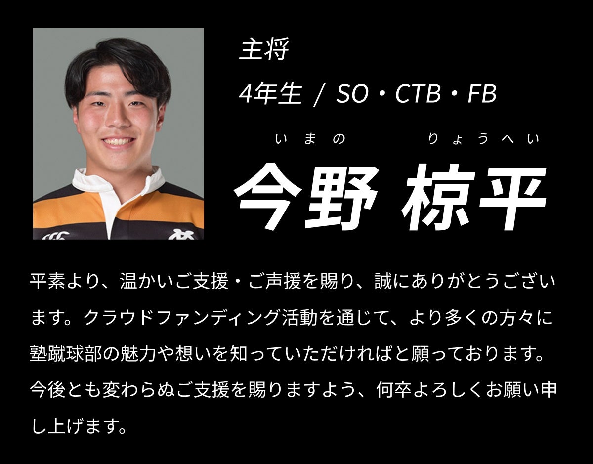 すでに応援してくださっている方はもちろんこれまで慶應ラグビーと縁のなかった方々にも、そうした想いを届けたい。そしてその応援に「慶應らしい戦い方」「魂のラグビー」と呼ばれるひたむきな戦い方で応えたい。それが、このクラウドファンディングを部員自ら立ち上げた理由です。