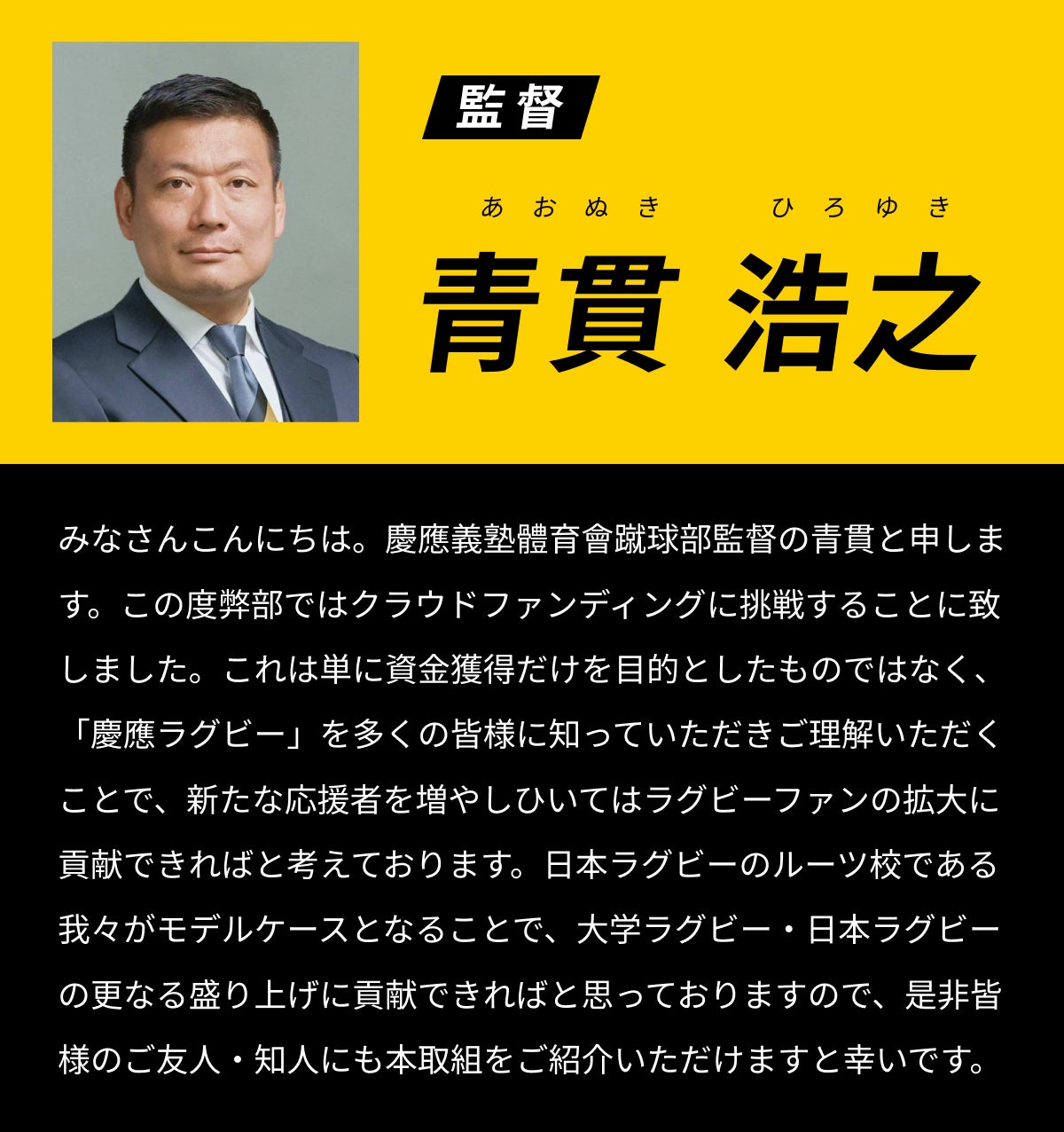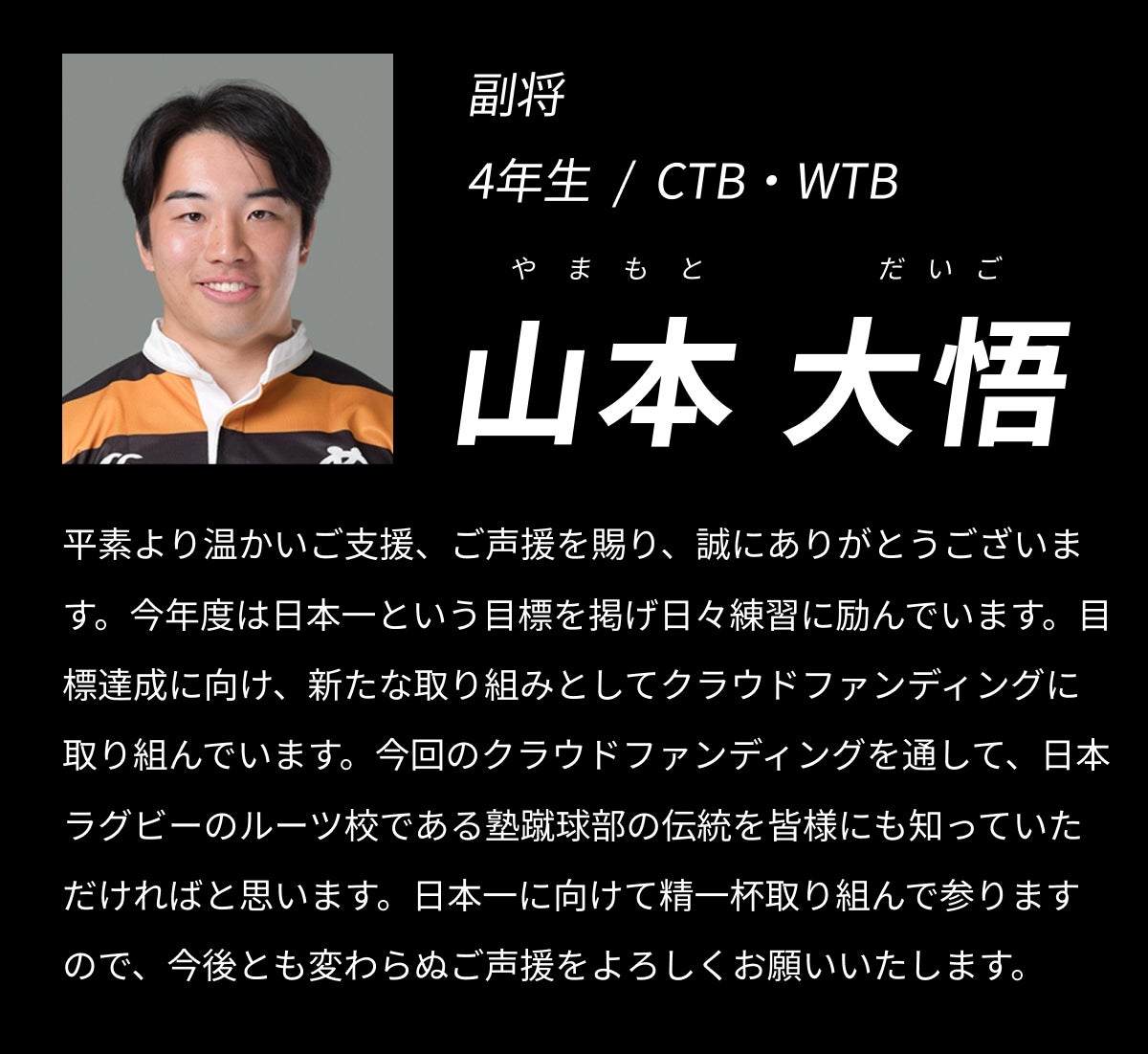 2025/11/01 22:36日頃より塾蹴球部の活動にご理解とご支援を賜り、御礼申し上げます。慶應義塾體育會蹴球部です。クラウドファンディング終了まで残り一日となりました。目標金額達成まで、ぜひご支援のほど、よろしくお願いいたします。4年生の「ラストシーズンに懸ける想い」の最終回をお届けします。それぞれの想いを胸に、ラストシーズンを駆け抜ける私たちの姿を見守っていただけますと幸いです。今野 椋平(SO,CTB,FB/桐蔭学園)大学卒業後は、17年間続けてきたラグビー人生に一区切りをつけることになります。悔いのないよう、自分の全力を出し切ってこのラストシーズンを終えたいと思います。また、主将としての役割を完遂し、チームを勝利に導く。それが、これまで支えてくださった数えきれない方々への恩返しだと信じています。最後まで全力で戦い抜きますので、引き続き温かいご声援のほどよろしくお願いいたします。山本 大悟(CTB,WTB/常翔学園)卒業後にラグビーから離れる決断をした自分にとって、大学ラグビーは11年のラグビー人生の区切りです。最後に振り返って後悔が無いように、全力で取り組んで完全燃焼を目指します。副将として、個人として、全身全霊でチームに貢献します。米津 幸治(FL,NO.8/慶應義塾)慶應ラグビー部の一員として戦えることが、私にとって最大の誇りであります。先輩方が築いてきた伝統を受け継ぎ、仲間とともに「かっこいい慶應ラグビー」を体現することを常に意識してきました。最後のシーズンはこの誇りを胸に、チームの勝利のために全力を尽くします。藤田 祥平(Coach/慶應義塾)この言葉を兄のように慕う先輩方から教わりました。“難が有ることこそ、有り難い”無難な人生よりも、苦難や困難・災難があるからこそ、人は成長し、強くなり、感謝を知る。コロナで活動中止。両膝の大怪我。学生コーチ選出による選手引退。すべての「難」が、私のラグビー人生を豊かにしてくれました。だから今、この道を歩めたことを心から「有り難い」と思っています。支えてくれたすべての仲間、指導者、家族への感謝を胸に慶應ラグビーファミリーと日本一の喜びを分かち合うその日まで「有り難し」の心を胸に、最後まで全力で取り組みます。安田 雄翔(Coach/甲南)ラストシーズン、学生コーチとしての情熱をこのチームにすべて注ぐ覚悟です。これまで積み上げてきた仲間の努力を必ず形にし、最高の舞台で選手が輝く瞬間をつくれるよう尽力します。引き続き温かいご声援のほど、よろしくお願いいたします。中井 優(MGR/慶應義塾)5歳で始めたラグビーも、あと少しで終わってしまいます。黒黄に袖を通した喜びもあれば、選手を退く苦しみなど、本当に紆余曲折ありました。ラグビーを通してたくさんの人に出会い、多くの経験をさせていただいたこの17年間は、僕にとってかけがいのない財産です。17年間の軌跡、そして126年のこの部の歴史、その誇りを胸に自分の役割を遂行します。最後まで応援のほど、よろしくお願いいたします。 もっと見る11/2(日)23:59の終了まで残り2日!あと116万円が必要です/126代 ラストシーズンに懸ける想い Part.3