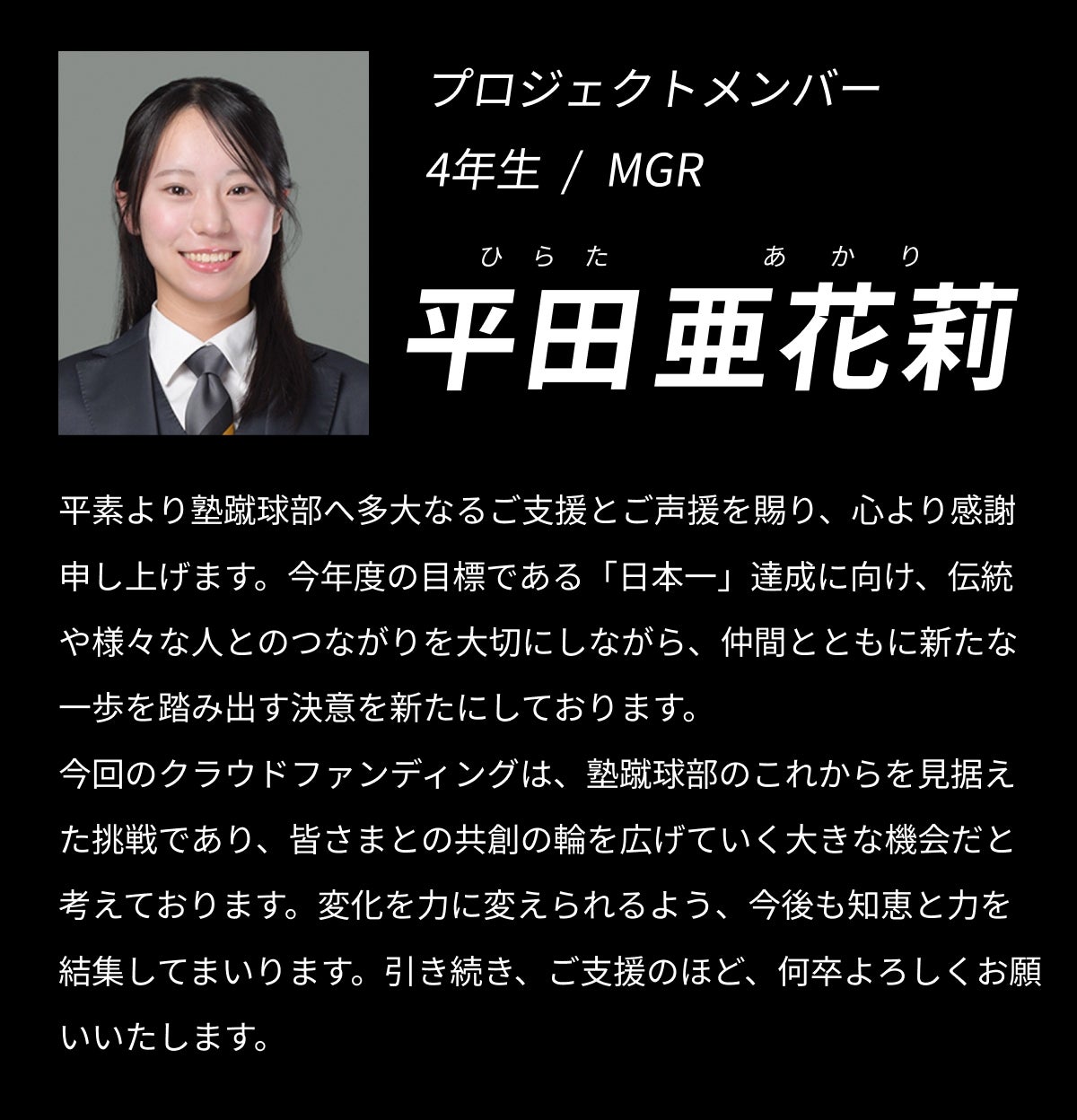 2025/10/31 22:13日頃より塾蹴球部の活動にご理解とご支援を賜り、御礼申し上げます。慶應義塾體育會蹴球部です。クラウドファンディング終了まで残り二日となりました。目標金額達成まで、ぜひご支援のほど、よろしくお願いいたします。前回に続き、4年生の「ラストシーズンに懸ける想い」をお届けします。それぞれの想いを胸に、ラストシーズンを駆け抜ける私たちの姿を見守っていただけますと幸いです。永島 優介(LO/修猷館)怪我も多く経験し辛い時期も多かったですが、同期をはじめ多くの人に支えられてきた4年間でした。残り少ない期間、グラウンドでLOとして舞い、チームの勝利に貢献できるよう頑張ります。西澤 賢佑(PR/膳所)これまでのラグビー人生で得た、かけがえのない「友」と友情コンボを爆発させます。最後まで走り抜けて、お世話になった人々に恩返しできるように頑張ります。橋本 弾介(SH/慶應義塾)私は17年間のラグビー生活のうち10年を慶應ラグビーという組織の中で過ごしてきました。先輩後輩同期だけでなく多くの方々に出逢い、支えられたラグビー生活だったなと感じています。関わってくれた全ての方々への感謝を忘れずに残り少ないシーズンを全力で駆け抜けたいと思います。今年のチームは一つ一つ積み上げ、毎試合強くなるチームだと思います。最後まで個人・チームともに努力を重ね、目標である日本一を達成します。引き続き応援よろしくお願いいたします。土方 直也(PR/慶應義塾)10年間の慶應ラグビー人生を締めくくるという思いを込めました。最後のシーズンで、今までやってきたことをすべてを結び合わせる集大成の時間にしたいと思います。平田 亜花莉(MGR/桐蔭学園)入部前には到底想像しえなかった濃い4年間を過ごさせてもらっていることに心から感謝しています。私が携わらせていただいている”今”が、蹴球部の5年後、10年後にも繋がっていると信じて、妥協することなく貪欲に取り組み続けます。ラストシーズンは、共に戦ってきた仲間と同じ目標を追い続け、嬉し涙で終われるシーズンにします。日々勝つ準備をしている選手たちへ、変わらぬ温かいご声援を賜りますようお願い申し上げます。百田 航(SO,CTB,FB/慶應義塾)何も後悔を残さず、全てを出し切って18年間の結びをしたい。そのために全力でラグビーや同期との時間を楽しみ、勝利を追い求めるシーズンにします。矢﨑 隼太(LO,FL/県立千葉)今年は思うようにいかないことも多く、苦しいシーズンですが、一つひとつ、愚直に自分のできることを全うし、チームの日本一という目標に少しでも貢献したいと思います。山中 優太郎(PR,NO.8/慶應義塾)慶應中等部でラグビーを始めてから約10年。後半の年月は、苦しさや悔しさの連続でした。高校時代はコロナ禍で満足に練習できず、大学では度重なる怪我に苦しみ、2年間で三度の手術も経験しました。特に3年冬のアキレス腱断裂の際には退部も考えましたが、「まだやれる」と励ましてくれた仲間、家族、友人がいたからこそ今自分はここにいることができています。何度倒れても前に進み続けてきた自負を胸に、中学時代から憧れてきた舞台に立つため、残りの学生生活を全力で頑張りたいと思います。渡邉 哲暉(PR/慶應義塾)大学に入ってからのラグビーは、怪我が多く、まともにプレーすることができませんでした。そのため、自分はこの4年間を通してとにかく後悔なく終わりたいと思うようになりました。卒業した後に後悔が残らないよう、毎日自分ができることに尽力していきます。 もっと見る