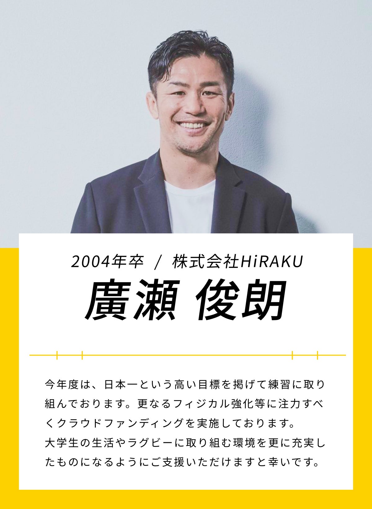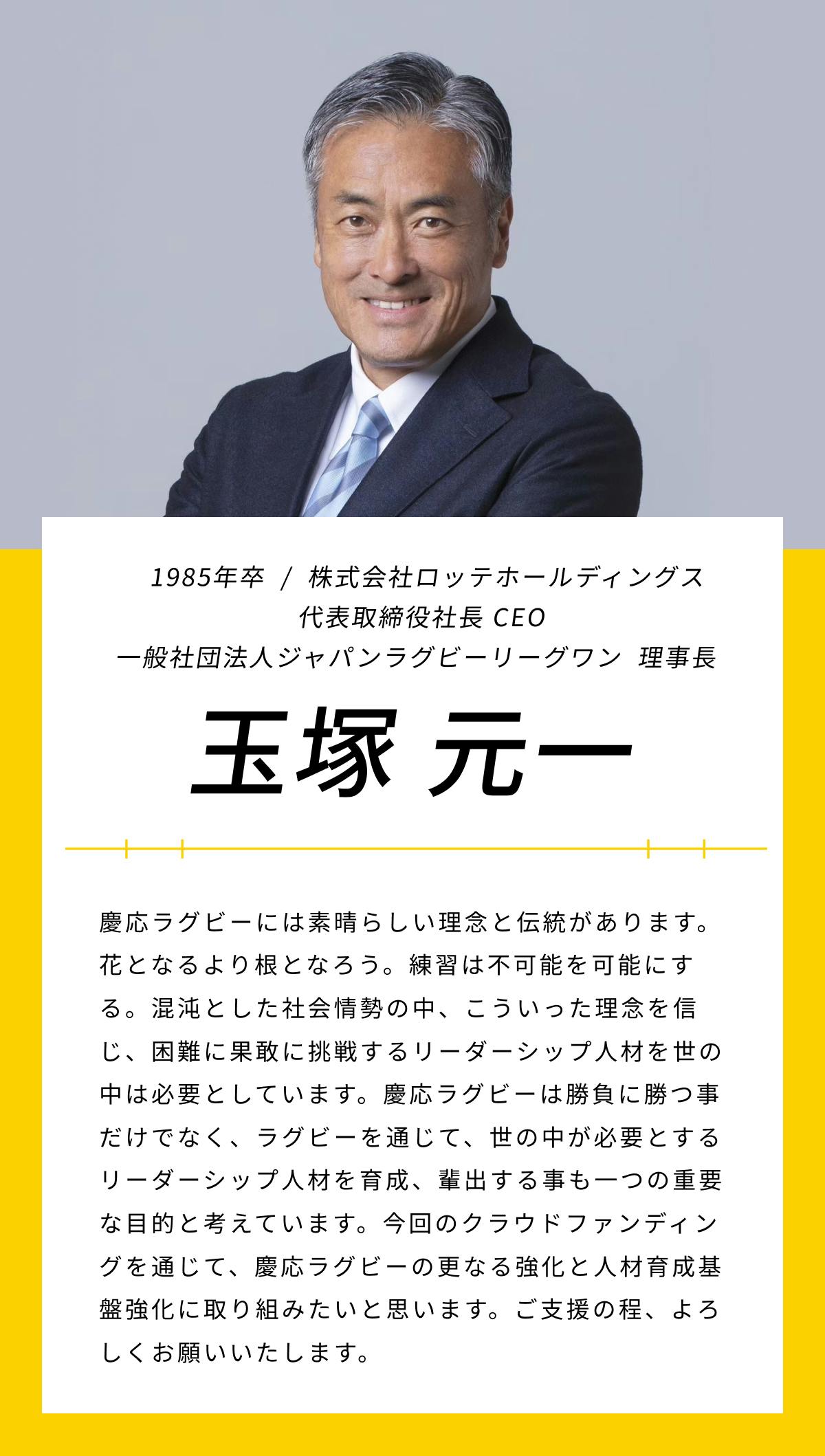私たち慶應ラグビー部は、「文武両道」の精神を大切にしてきました。ラグビーだけにとどまらず、卒業後さまざまな分野で活躍されているOBの方々が、今回の挑戦に応援の声を寄せてくださいました。