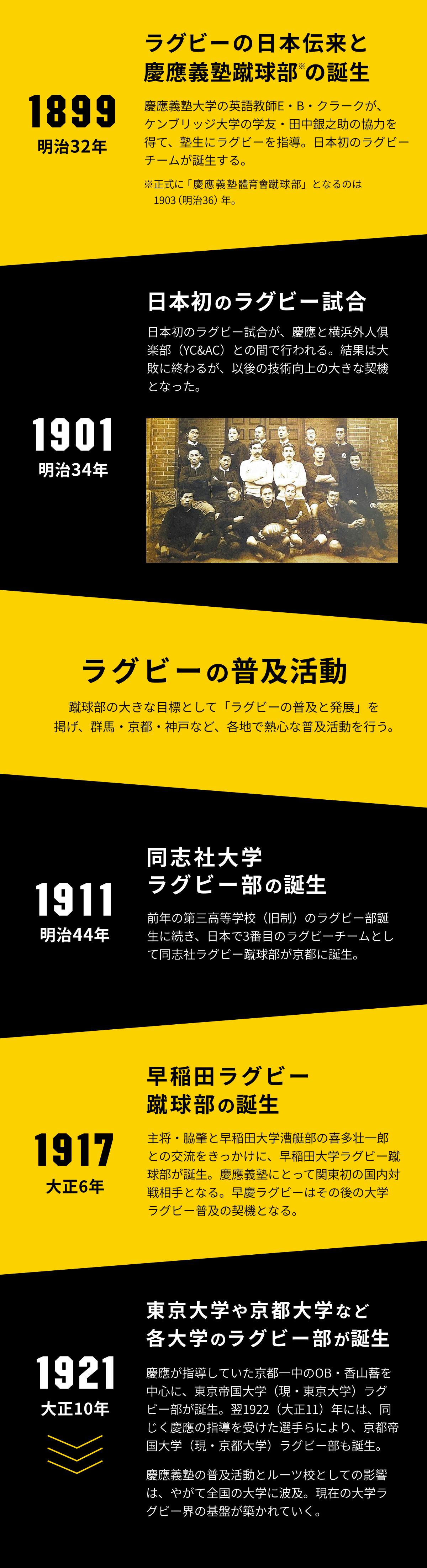 はじめての試合はその2年後の1901年、横浜の外国人クラブYC&ACと対戦し、35対5のスコアで敗れた記録が残っています。その後、自分たちの鍛錬に加え、当時の部員たちによる他大学への普及活動が全国に広まり、1911年に同志社大学(※3)、1917年に早稲田大学(※4)、1922年に京都大学のラグビー部(※5)が誕生。その後も東京大学、明治大学をはじめとする様々な大学へと波及し、着々と賛同者を増やしていった先輩方の活動が国内の大学ラグビー創設の原点となりました。