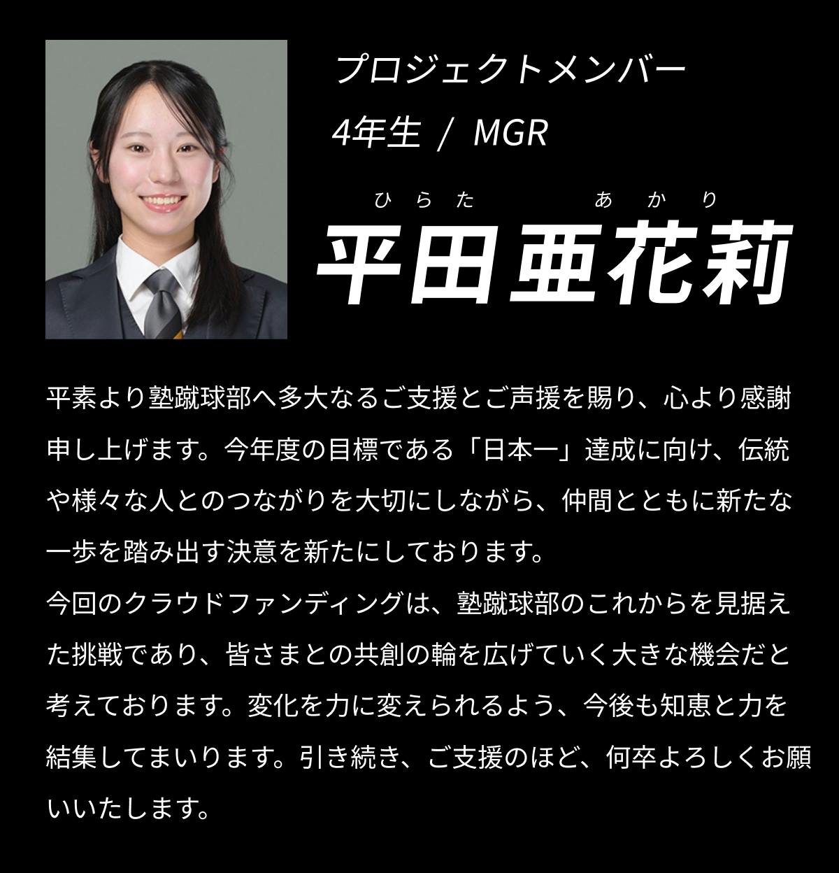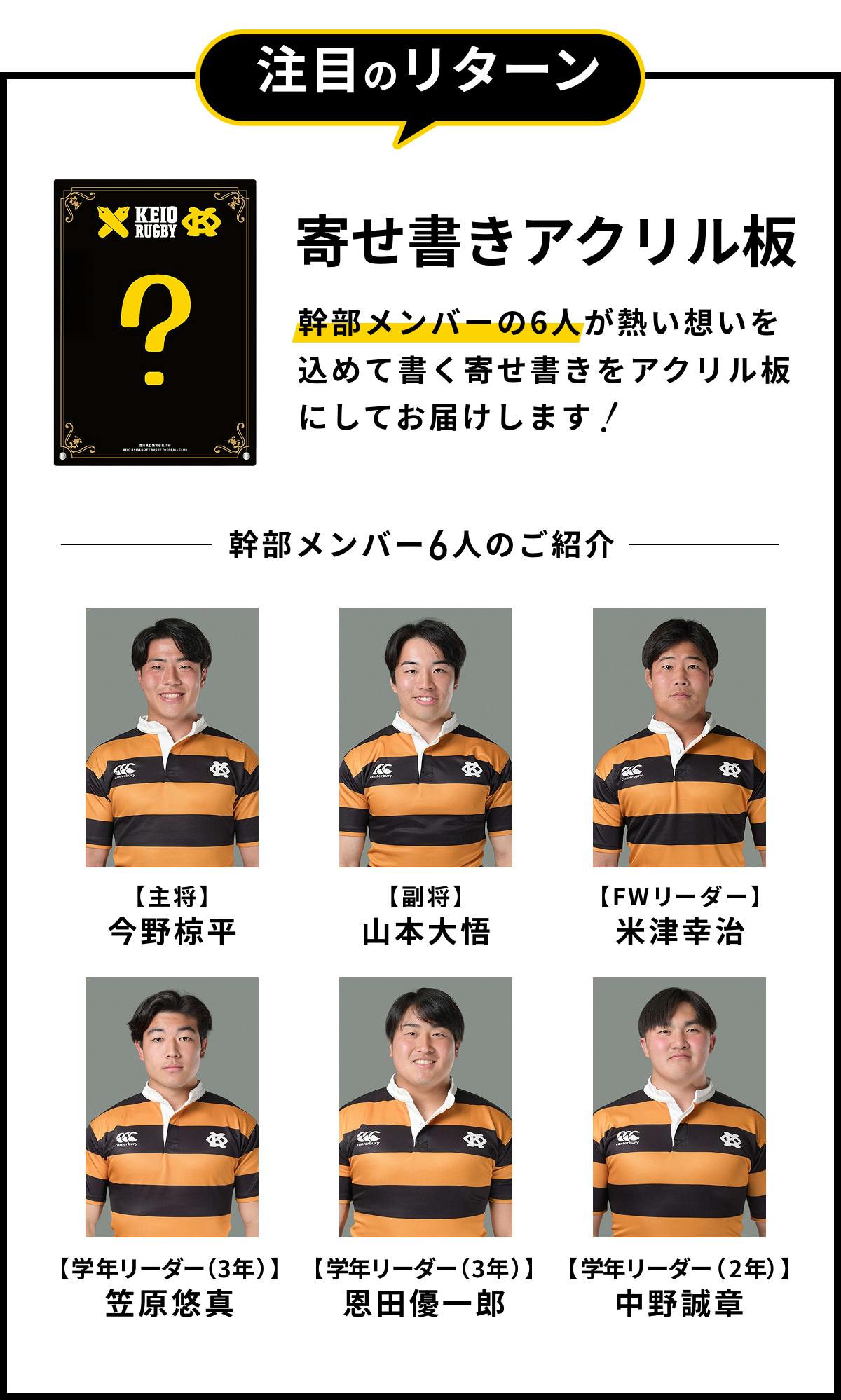 2025/10/31 22:13日頃より塾蹴球部の活動にご理解とご支援を賜り、御礼申し上げます。慶應義塾體育會蹴球部です。クラウドファンディング終了まで残り二日となりました。目標金額達成まで、ぜひご支援のほど、よろしくお願いいたします。前回に続き、4年生の「ラストシーズンに懸ける想い」をお届けします。それぞれの想いを胸に、ラストシーズンを駆け抜ける私たちの姿を見守っていただけますと幸いです。永島 優介(LO/修猷館)怪我も多く経験し辛い時期も多かったですが、同期をはじめ多くの人に支えられてきた4年間でした。残り少ない期間、グラウンドでLOとして舞い、チームの勝利に貢献できるよう頑張ります。西澤 賢佑(PR/膳所)これまでのラグビー人生で得た、かけがえのない「友」と友情コンボを爆発させます。最後まで走り抜けて、お世話になった人々に恩返しできるように頑張ります。橋本 弾介(SH/慶應義塾)私は17年間のラグビー生活のうち10年を慶應ラグビーという組織の中で過ごしてきました。先輩後輩同期だけでなく多くの方々に出逢い、支えられたラグビー生活だったなと感じています。関わってくれた全ての方々への感謝を忘れずに残り少ないシーズンを全力で駆け抜けたいと思います。今年のチームは一つ一つ積み上げ、毎試合強くなるチームだと思います。最後まで個人・チームともに努力を重ね、目標である日本一を達成します。引き続き応援よろしくお願いいたします。土方 直也(PR/慶應義塾)10年間の慶應ラグビー人生を締めくくるという思いを込めました。最後のシーズンで、今までやってきたことをすべてを結び合わせる集大成の時間にしたいと思います。平田 亜花莉(MGR/桐蔭学園)入部前には到底想像しえなかった濃い4年間を過ごさせてもらっていることに心から感謝しています。私が携わらせていただいている”今”が、蹴球部の5年後、10年後にも繋がっていると信じて、妥協することなく貪欲に取り組み続けます。ラストシーズンは、共に戦ってきた仲間と同じ目標を追い続け、嬉し涙で終われるシーズンにします。日々勝つ準備をしている選手たちへ、変わらぬ温かいご声援を賜りますようお願い申し上げます。百田 航(SO,CTB,FB/慶應義塾)何も後悔を残さず、全てを出し切って18年間の結びをしたい。そのために全力でラグビーや同期との時間を楽しみ、勝利を追い求めるシーズンにします。矢﨑 隼太(LO,FL/県立千葉)今年は思うようにいかないことも多く、苦しいシーズンですが、一つひとつ、愚直に自分のできることを全うし、チームの日本一という目標に少しでも貢献したいと思います。山中 優太郎(PR,NO.8/慶應義塾)慶應中等部でラグビーを始めてから約10年。後半の年月は、苦しさや悔しさの連続でした。高校時代はコロナ禍で満足に練習できず、大学では度重なる怪我に苦しみ、2年間で三度の手術も経験しました。特に3年冬のアキレス腱断裂の際には退部も考えましたが、「まだやれる」と励ましてくれた仲間、家族、友人がいたからこそ今自分はここにいることができています。何度倒れても前に進み続けてきた自負を胸に、中学時代から憧れてきた舞台に立つため、残りの学生生活を全力で頑張りたいと思います。渡邉 哲暉(PR/慶應義塾)大学に入ってからのラグビーは、怪我が多く、まともにプレーすることができませんでした。そのため、自分はこの4年間を通してとにかく後悔なく終わりたいと思うようになりました。卒業した後に後悔が残らないよう、毎日自分ができることに尽力していきます。 もっと見る
