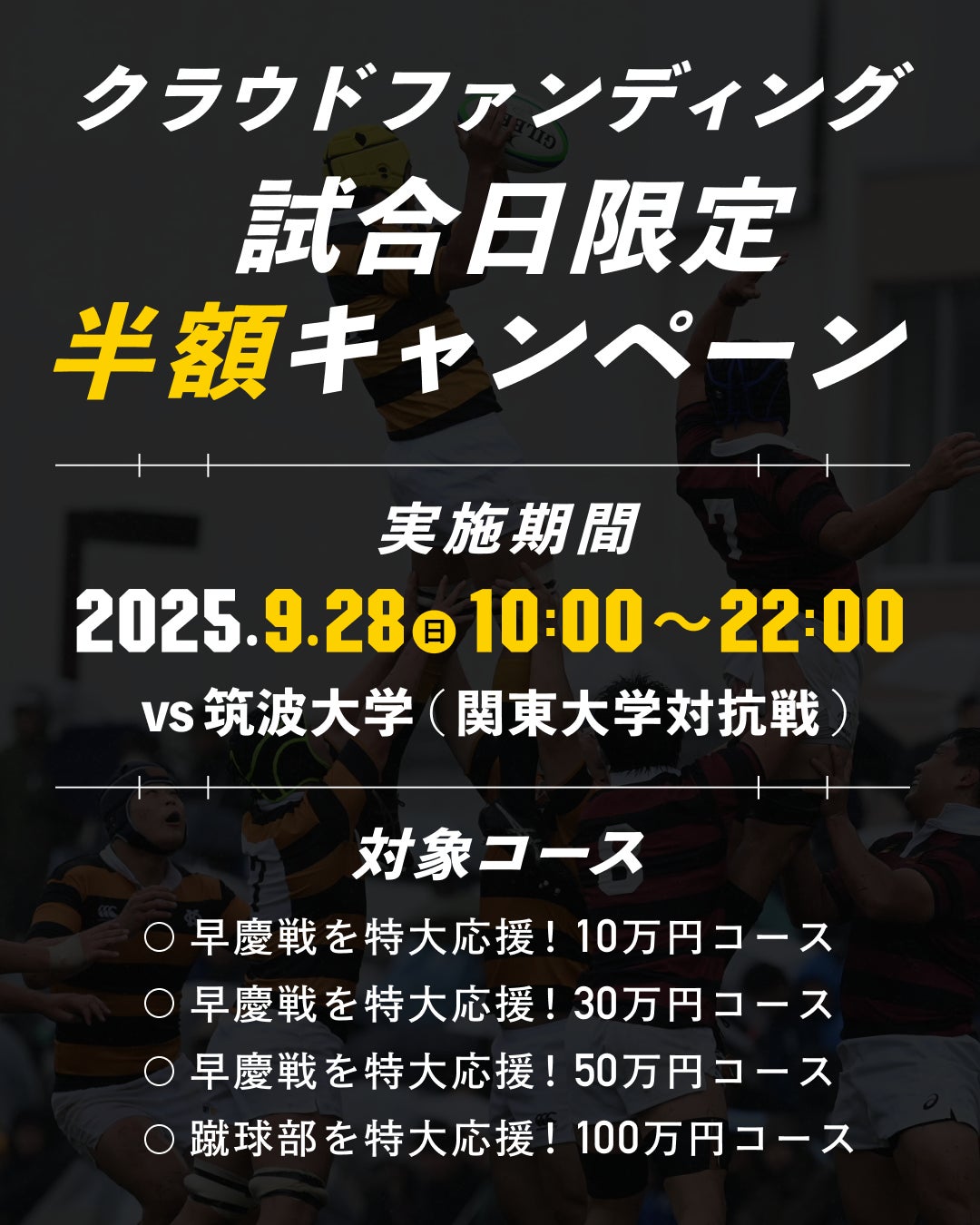 9/28(日)は筑波大学との大事な一戦が予定されております。クラウドファンディングで試合日だけの特別企画を実施します!試合当日の12時間限定で以下対象リターンが半額になります。