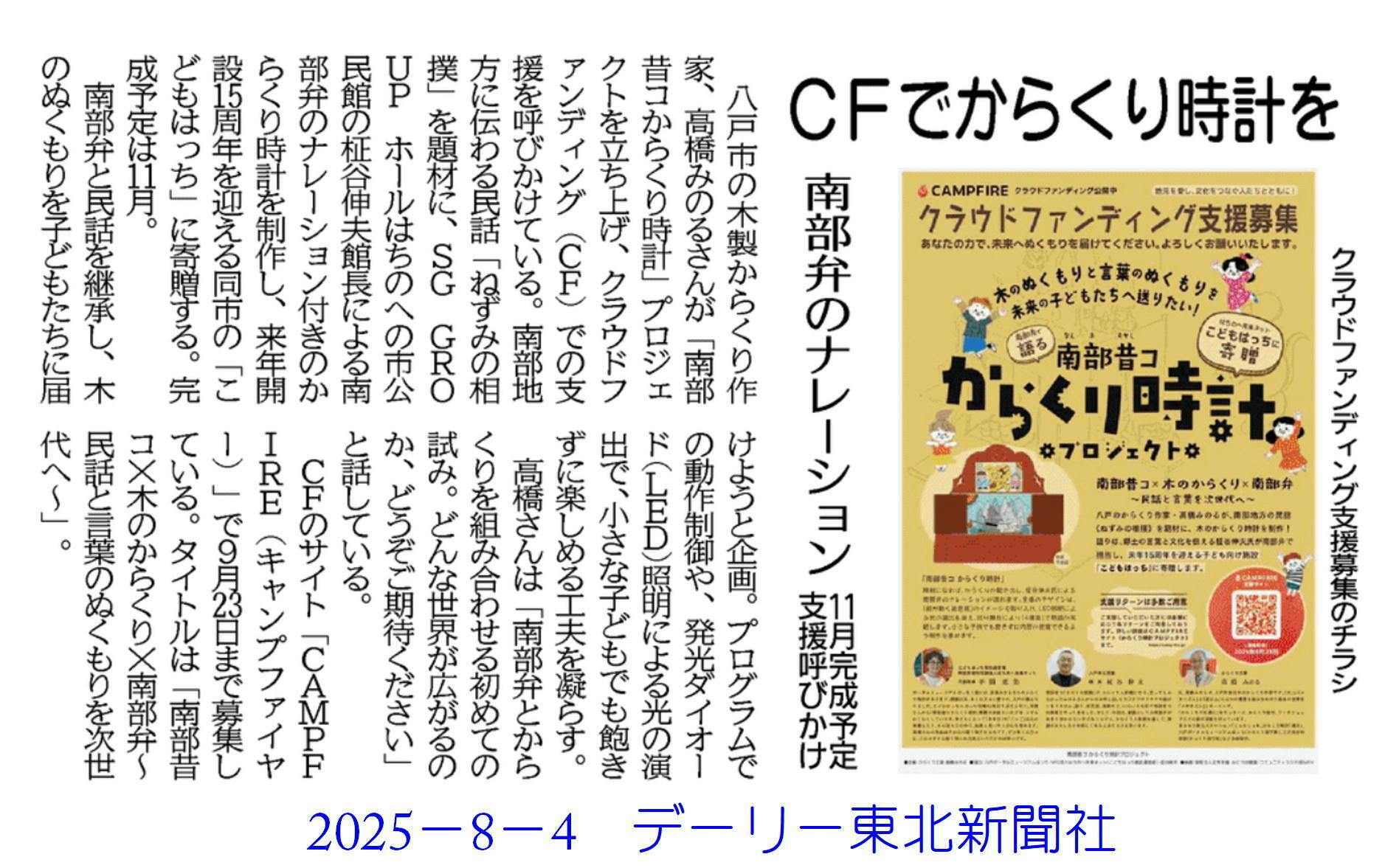 8月4日、デーリー東北新聞社様の記事に掲載していただきました。