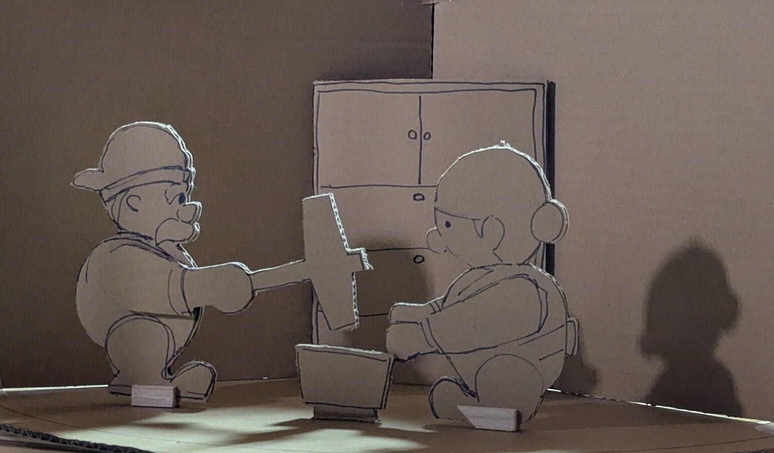 やせ細ったネズミに食べさせてやろうと、心優しいおじいさんとおばあさんが力を合わせて餅をついています。