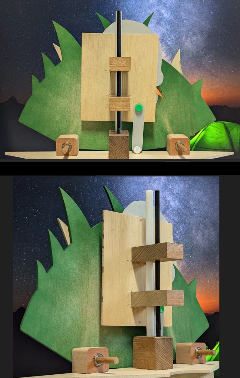 メカ部分は、画用紙やベニヤ板、画鋲などを使いながら仮組みし、動きの“最適解”を探っているところです。