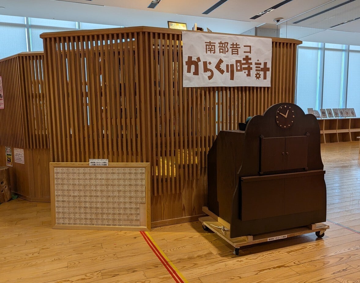ドネーションボード・木札プレート(6×6㎝)は、からくり時計の横に設置しております。現在は仮置きの状態ですが、近日中に壁面へ取り付ける予定です。