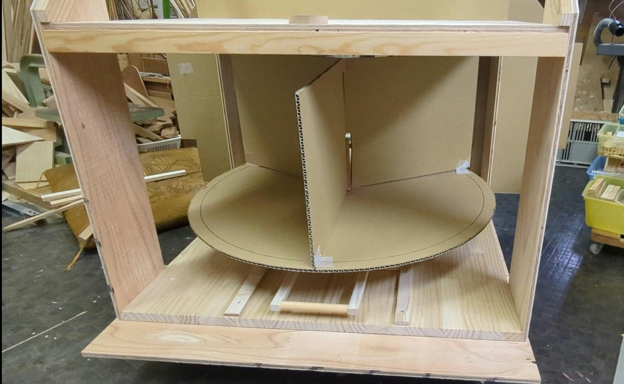 「回り舞台」では「3場面」が登場します。その中心にモータを置いて舞台は回転します。段ボールで仮組み、大きさの確認をしながら制作しています。