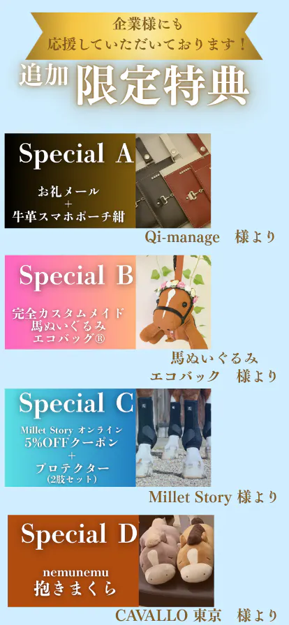 このセカンドゴール50万円は、「乗馬クラブ応援物資ページの制作」に使わせていただきたいと思います。