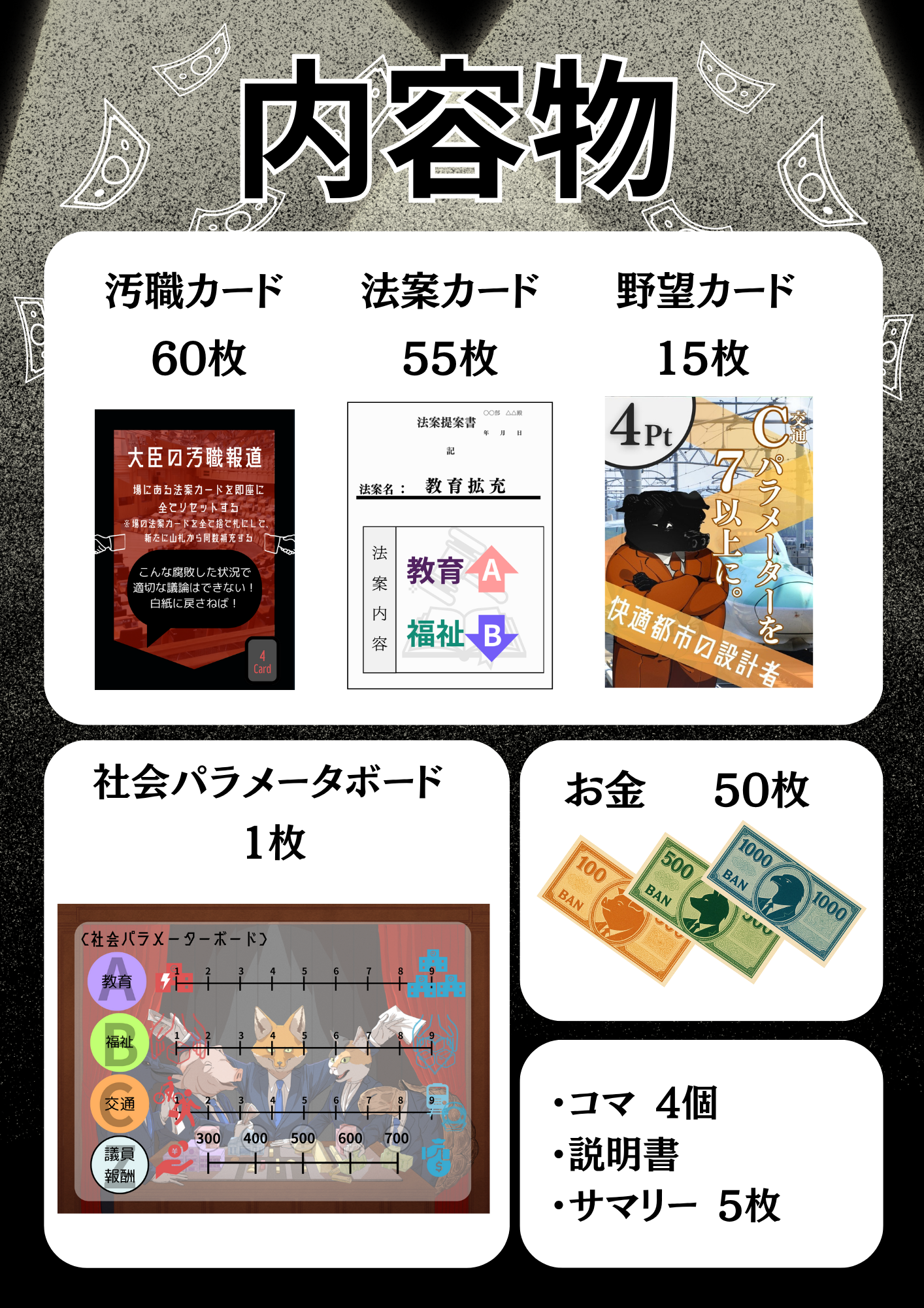 内容物:汚職カード60枚、法案カード55枚、野望カード15枚、社会パラメータボード1枚、お金50枚、コマ4個、説明書、サマリー5枚