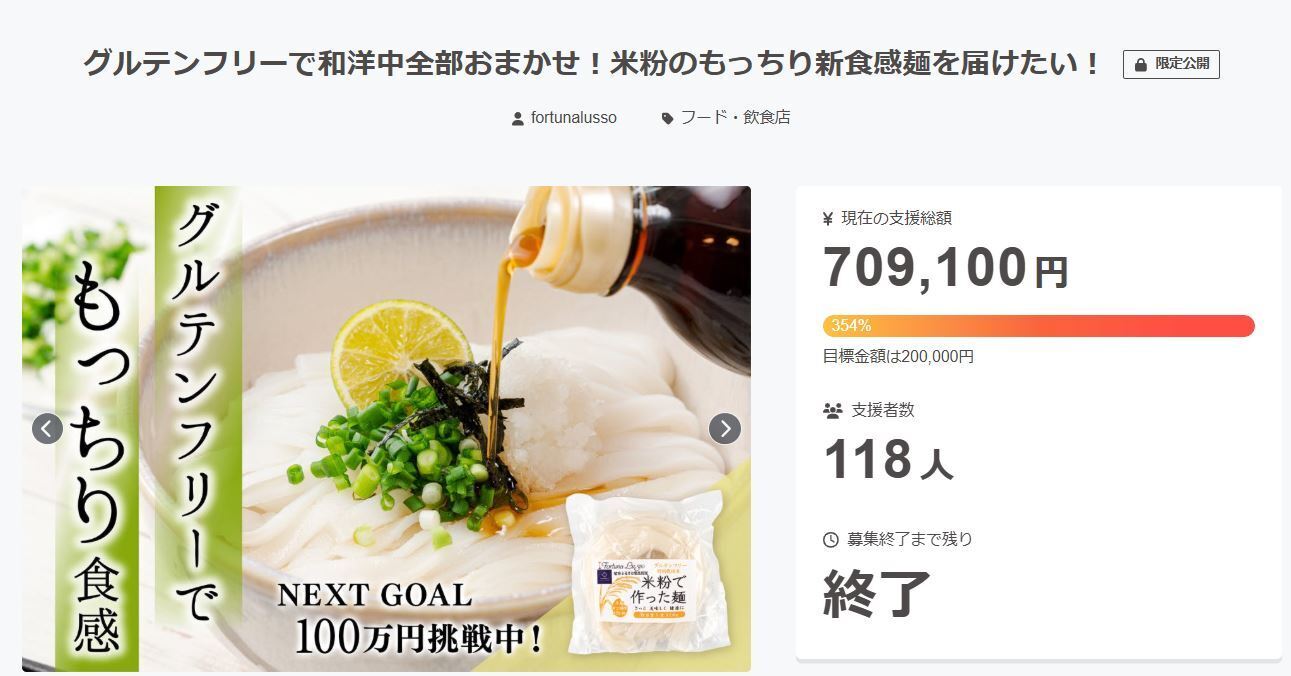 2025/09/04 13:26この度は「グルテンフリーで和洋中全部おまかせ!米粉のもっちり新食感麺を届けたい!」プロジェクトに、たくさんのご支援と応援をいただき誠にありがとうございました。8月末をもちまして最終ネクストチャレンジ目標には達成できなかったものの、最終的に 118名の方から 709,100円(目標達成率354%) という大きなご支援をいただき、無事にプロジェクトを終了することができました。皆様のお力添えに心より感謝申し上げます。これからは、頂いたご支援をもとに米粉麺をさらに多くの方にお届けできるよう、スタッフ一同努めてまいります。今後の活動や発送の進捗も随時ご報告してまいりますので、引き続き見守っていただけますと幸いです。本当にありがとうございました。米粉Sweets&Cafe Fortuna Lusso株式会社 MEDFOOD JAPAN もっと見る