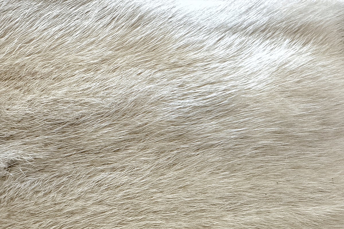 ★外観:ミンクの毛皮は、密度の高い艶やかな刺し毛(外側の長い毛)と、密に生えそろった綿毛(内側の短い毛)が特徴です。