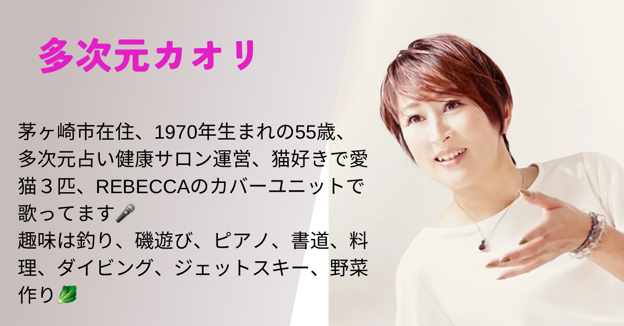 こんにちは、多次元カオリと申します。茅ヶ崎市サザンビーチ近くで「多次元サロン」という占い健康サロンを運営し、人とペットの心身の健康をサポートしています。