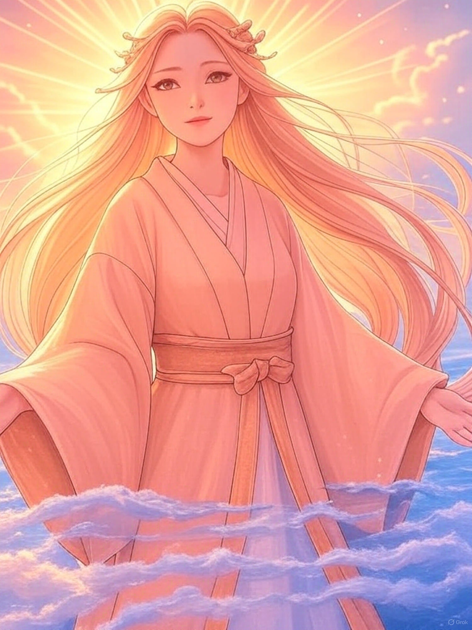 1. 天照大神(光の始まり)メッセージ:あなたの過去は希望の光で始まった。どんな暗闇も、内に秘めた輝きで乗り越えてきたことを思い出して。(数秘:1=リーダーシップ)