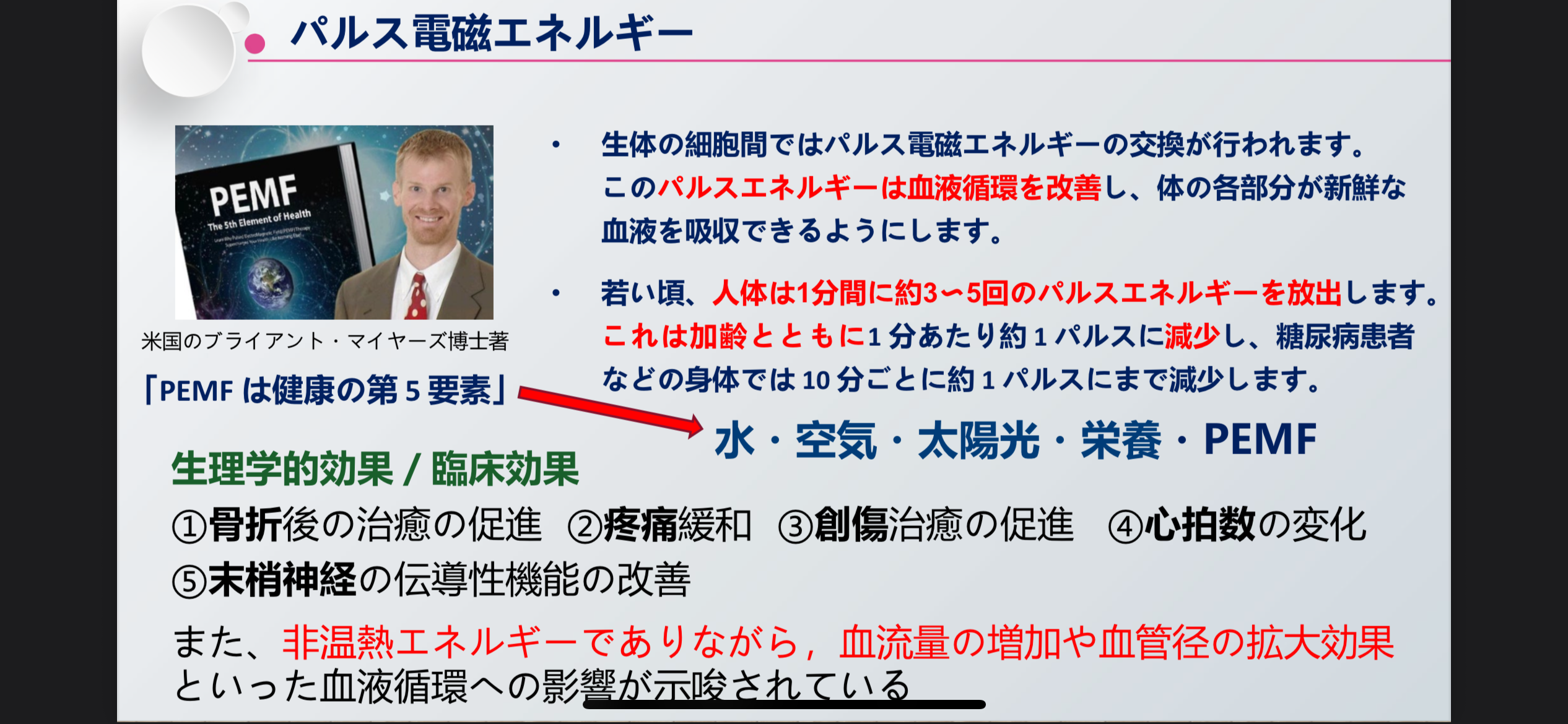 2025/07/15 12:40PEMFはパルス電磁場といい、NASAで研究開発された。宇宙飛行士は徹底的に健康チェックをして、100%健康でないと宇宙には行けない。しかし、宇宙船では水も酸素も栄養も完璧なのに、数ヶ月間、宇宙空間で無重力状態で過ごして地球に帰還すると、骨密度の低下や、精神不安定、筋肉の萎縮で立てないなど、不健康な状態になってしまう。 最初は理由が分からなかったが、やがて、地球は巨大な磁石であり、北極と南極があり、人が健康に生きるには、水、酸素、太陽の他に、地球の磁場(地磁気)が必要不可欠という事がわかった。 NASAは研究を重ね、PEMF(パルス電磁場)が骨の成長を促進し、ミトコンドリアの機能を向上させ、細胞の修復を助ける事から傷の治りが早く、軟骨再生、炎症を抑え、痛みの軽減、血液循環の改善、有酸素運動の効果により代謝が上がる、酸化ストレスを減らすなど、生体組織に様々な良い影響を与える事がわかってきた。 現代の宇宙船の中にはPEMF療法機器(パルス電磁場療法機器)が必ず設置されている。このPEMF発生器を家庭用に開発したのがP90。89回試作を重ねて90回目で極限までシンプルに誰でも簡単に使えるようになって、ようやく2024年に日本に入ってきました。 もっと見る