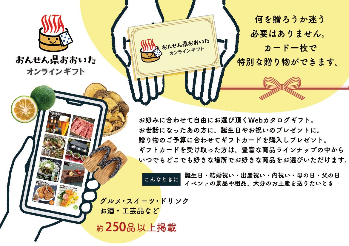 そんな「おんせん県おおいたオンラインショップ」から生まれたのが、選りすぐりの大分県産品250点以上の中から選べるデジタルカタログギフト「おんせん県おおいたオンラインギフト」です。