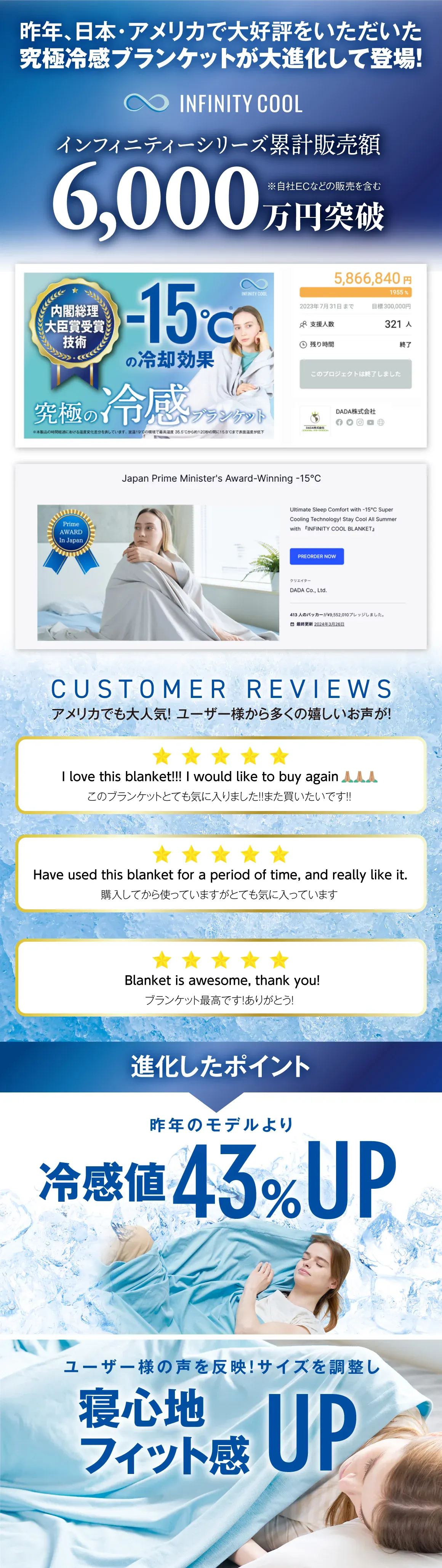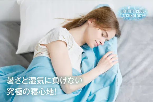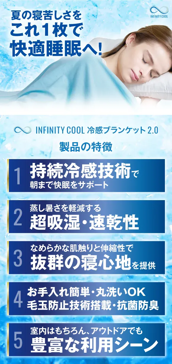「朝まで続く快適冷感」、「気持ち良い寝心地」、「利便性」の3大要素がそろった冷感ブランケット「INFINITY COOL BLANKET」第2弾で、理想な睡眠体験を。昨年大好評をいただいた、究極冷感ブランケットが進化して登場!お客様からのレビューをもとに製品を改良!冷感値アップ&さらなるフィット感を実現しました!