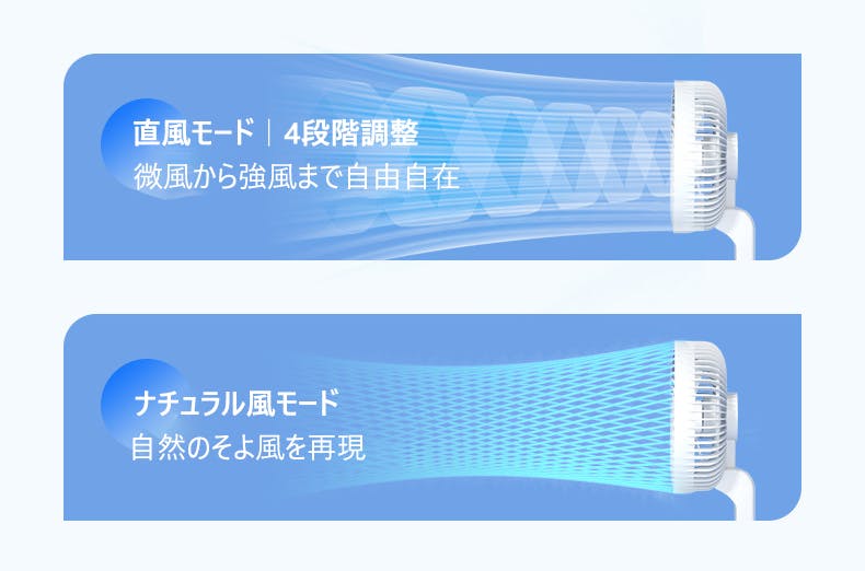 直風モードは、最大4段階の風量調整が可能。暑い日はしっかり涼しく、弱風にすればデスクワーク中にもぴったり。
