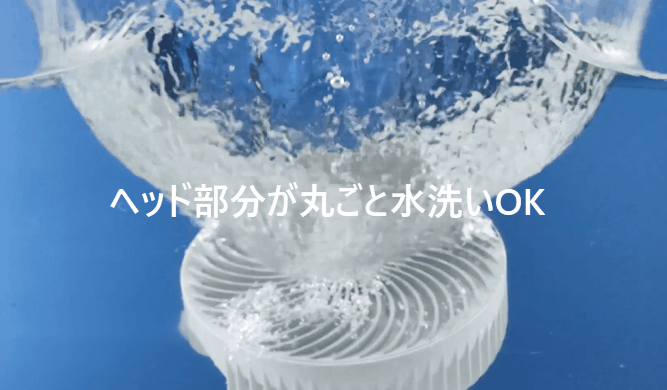 そのため、従来の扇風機のように複雑な内部機構や駆動部品がなく、工具不要で簡単に分解でき、ヘッド部分はまるごと水洗いが可能になります。